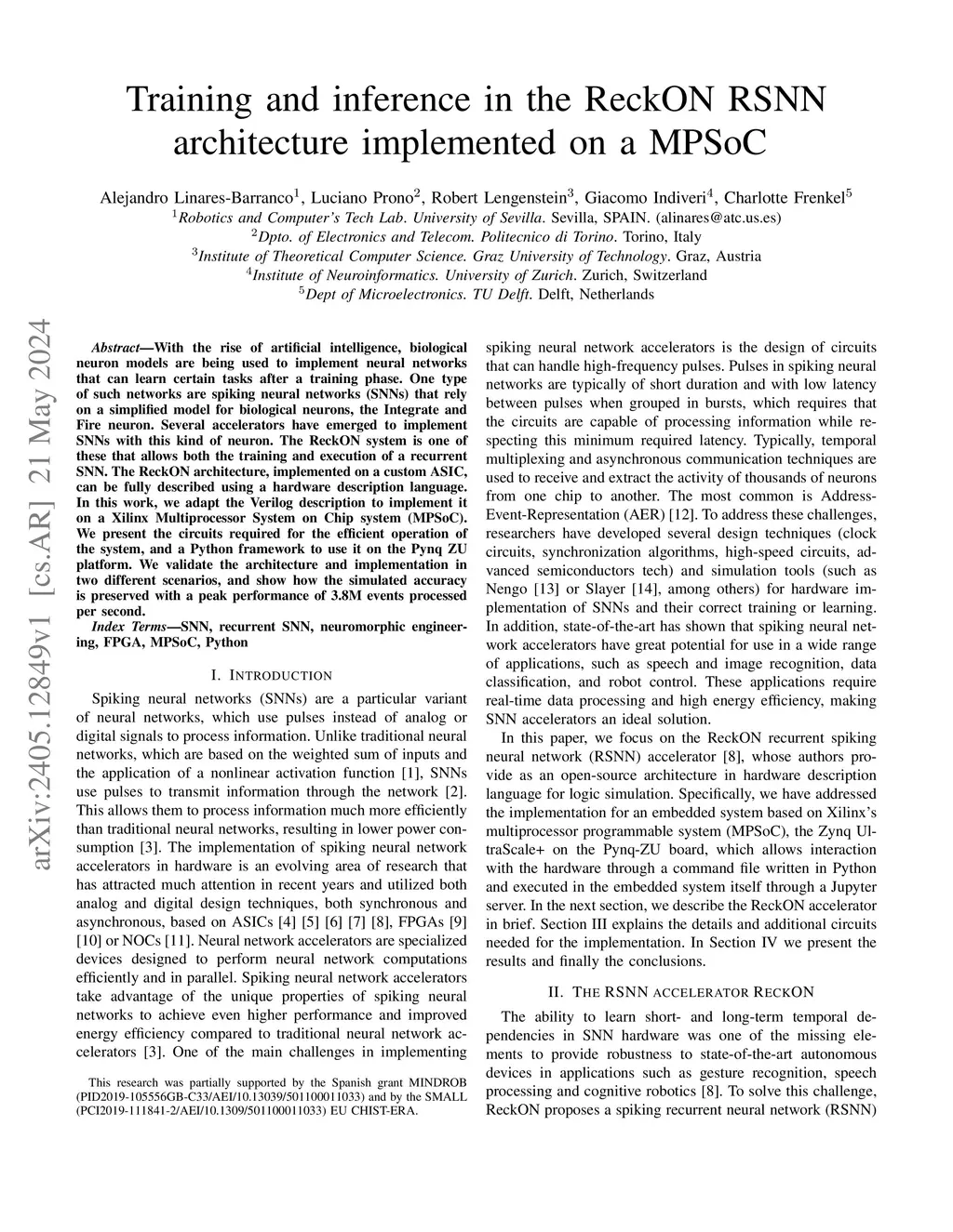 With the rise of artificial intelligence, neural network simulations of biological neuron models are being explored to reduce the footprint of learning and inference in resource-constrained task scenarios. A mainstream type of such networks are spiking neural networks (SNNs) based on simplified Integrate and Fire models for which several hardware accelerators have emerged. Among them, the ReckOn chip was introduced as a recurrent SNN allowing for both online training and execution of tasks based on arbitrary sensory modalities, demonstrated for vision, audition, and navigation. As a fully digital and open-source chip, we adapted ReckOn to be implemented on a Xilinx Multiprocessor System on Chip system (MPSoC), facilitating its deployment in embedded systems and increasing the setup flexibility. We present an overview of the system, and a Python framework to use it on a Pynq ZU platform. We validate the architecture and implementation in the new scenario of robotic arm control, and show how the simulated accuracy is preserved with a peak performance of 3.8M events processed per second.