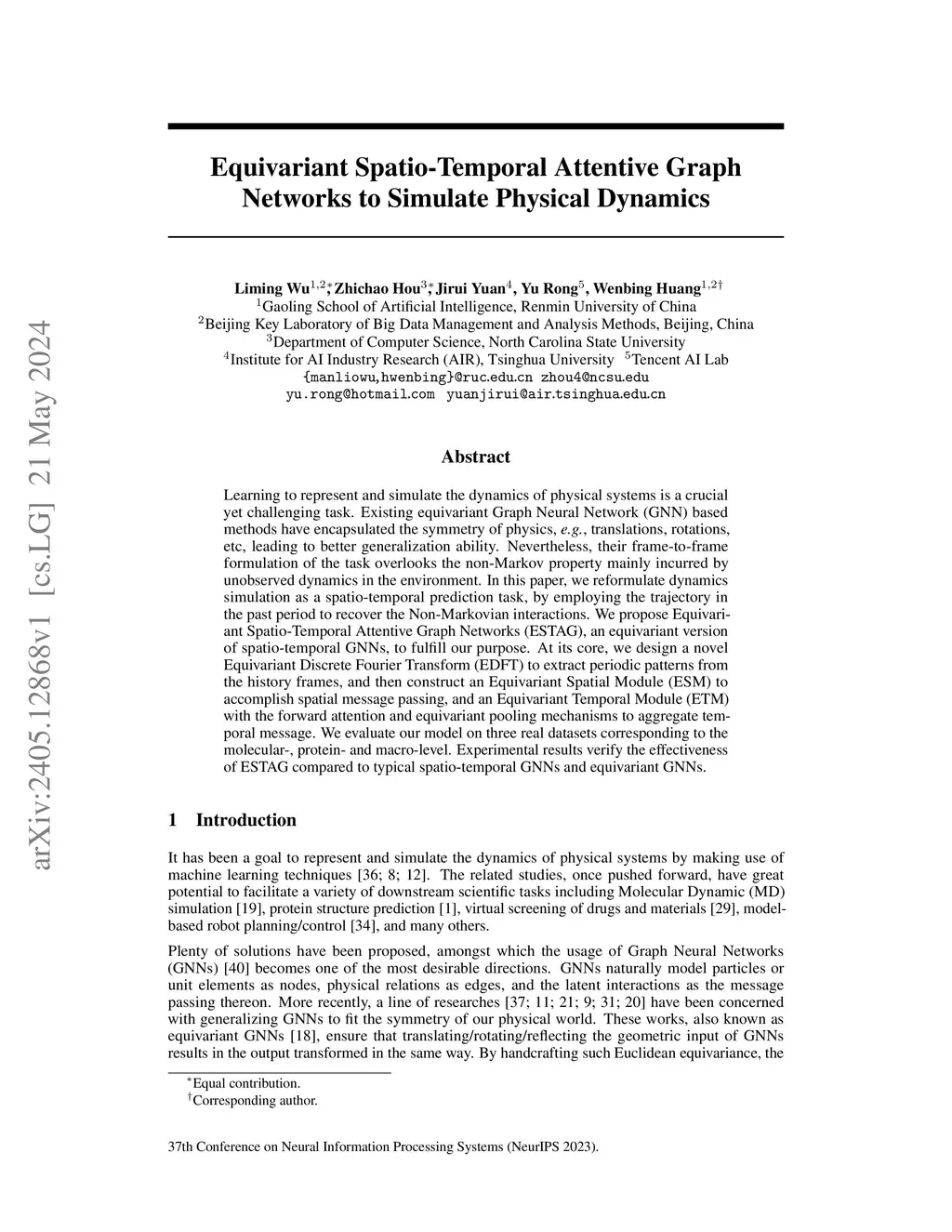 Learning to represent and simulate the dynamics of physical systems is a crucial yet challenging task. Existing equivariant Graph Neural Network (GNN) based methods have encapsulated the symmetry of physics, \emph{e.g.}, translations, rotations, etc, leading to better generalization ability. Nevertheless, their frame-to-frame formulation of the task overlooks the non-Markov property mainly incurred by unobserved dynamics in the environment. In this paper, we reformulate dynamics simulation as a spatio-temporal prediction task, by employing the trajectory in the past period to recover the Non-Markovian interactions. We propose Equivariant Spatio-Temporal Attentive Graph Networks (ESTAG), an equivariant version of spatio-temporal GNNs, to fulfill our purpose. At its core, we design a novel Equivariant Discrete Fourier Transform (EDFT) to extract periodic patterns from the history frames, and then construct an Equivariant Spatial Module (ESM) to accomplish spatial message passing, and an Equivariant Temporal Module (ETM) with the forward attention and equivariant pooling mechanisms to aggregate temporal message. We evaluate our model on three real datasets corresponding to the molecular-, protein- and macro-level. Experimental results verify the effectiveness of ESTAG compared to typical spatio-temporal GNNs and equivariant GNNs.