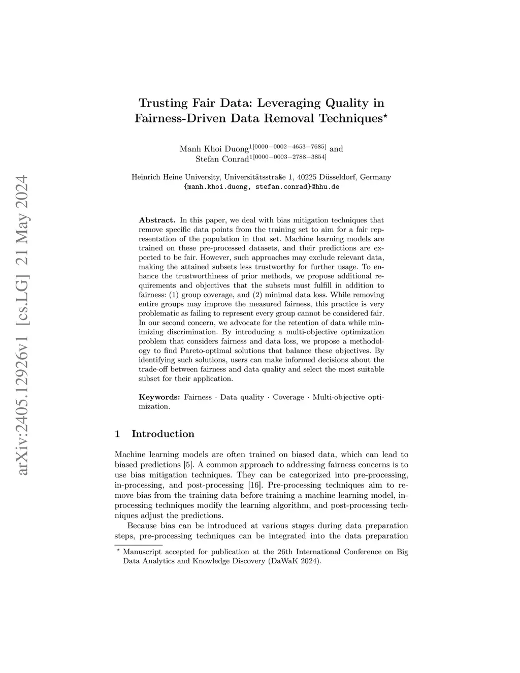 In this paper, we deal with bias mitigation techniques that remove specific data points from the training set to aim for a fair representation of the population in that set. Machine learning models are trained on these pre-processed datasets, and their predictions are expected to be fair. However, such approaches may exclude relevant data, making the attained subsets less trustworthy for further usage. To enhance the trustworthiness of prior methods, we propose additional requirements and objectives that the subsets must fulfill in addition to fairness: (1) group coverage, and (2) minimal data loss. While removing entire groups may improve the measured fairness, this practice is very problematic as failing to represent every group cannot be considered fair. In our second concern, we advocate for the retention of data while minimizing discrimination. By introducing a multi-objective optimization problem that considers fairness and data loss, we propose a methodology to find Pareto-optimal solutions that balance these objectives. By identifying such solutions, users can make informed decisions about the trade-off between fairness and data quality and select the most suitable subset for their application.