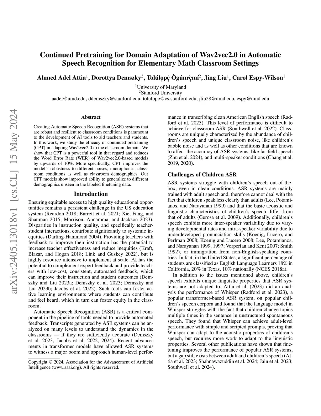 Creating Automatic Speech Recognition (ASR) systems that are robust and resilient to classroom conditions is paramount to the development of AI tools to aid teachers and students. In this work, we study the efficacy of continued pretraining (CPT) in adapting Wav2vec2.0 to the classroom domain. We show that CPT is a powerful tool in that regard and reduces the Word Error Rate (WER) of Wav2vec2.0-based models by upwards of 10%. More specifically, CPT improves the model's robustness to different noises, microphones, classroom conditions as well as classroom demographics. Our CPT models show improved ability to generalize to different demographics unseen in the labeled finetuning data.