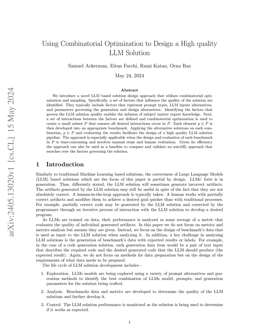We introduce a novel LLM based solution design approach that utilizes combinatorial optimization and sampling. Specifically, a set of factors that influence the quality of the solution are identified. They typically include factors that represent prompt types, LLM inputs alternatives, and parameters governing the generation and design alternatives. Identifying the factors that govern the LLM solution quality enables the infusion of subject matter expert knowledge. Next, a set of interactions between the factors are defined and combinatorial optimization is used to create a small subset that ensures all desired interactions occur in . Each element is then developed into an appropriate benchmark. Applying the alternative solutions on each combination, and evaluating the results facilitate the design of a high quality LLM solution pipeline. The approach is especially applicable when the design and evaluation of each benchmark in is time-consuming and involves manual steps and human evaluation. Given its efficiency the approach can also be used as a baseline to compare and validate an autoML approach that searches over the factors governing the solution.
