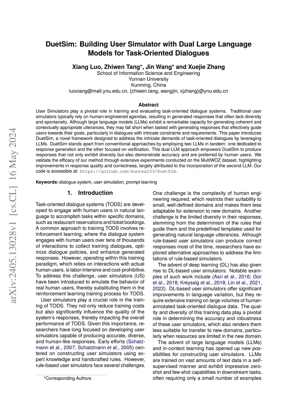 User Simulators play a pivotal role in training and evaluating task-oriented dialogue systems. Traditional user simulators typically rely on human-engineered agendas, resulting in generated responses that often lack diversity and spontaneity. Although large language models (LLMs) exhibit a remarkable capacity for generating coherent and contextually appropriate utterances, they may fall short when tasked with generating responses that effectively guide users towards their goals, particularly in dialogues with intricate constraints and requirements. This paper introduces DuetSim, a novel framework designed to address the intricate demands of task-oriented dialogues by leveraging LLMs. DuetSim stands apart from conventional approaches by employing two LLMs in tandem: one dedicated to response generation and the other focused on verification. This dual LLM approach empowers DuetSim to produce responses that not only exhibit diversity but also demonstrate accuracy and are preferred by human users. We validate the efficacy of our method through extensive experiments conducted on the MultiWOZ dataset, highlighting improvements in response quality and correctness, largely attributed to the incorporation of the second LLM. Our code is accessible at: https://github.com/suntea233/DuetSim.