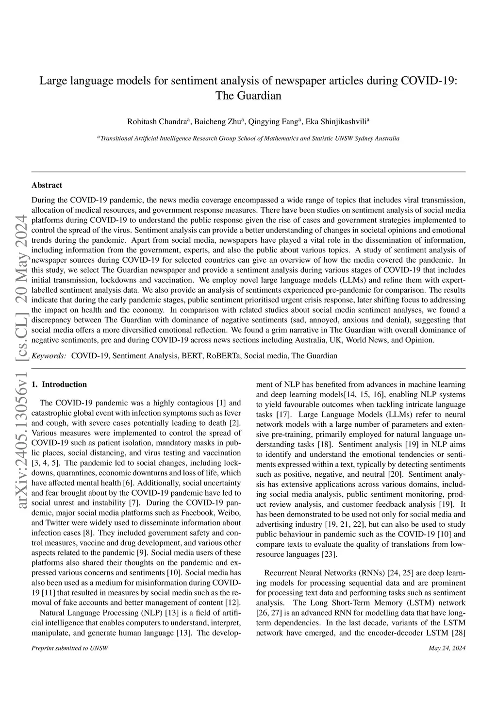 Large language models for newspaper sentiment analysis during COVID-19: The Guardian