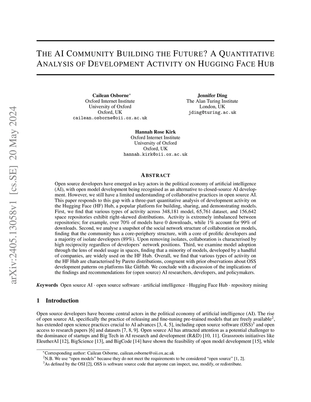 Open model developers have emerged as key actors in the political economy of artificial intelligence (AI), but we still have a limited understanding of collaborative practices in the open AI ecosystem. This paper responds to this gap with a three-part quantitative analysis of development activity on the Hugging Face (HF) Hub, a popular platform for building, sharing, and demonstrating models. First, various types of activity across 348,181 model, 65,761 dataset, and 156,642 space repositories exhibit right-skewed distributions. Activity is extremely imbalanced between repositories; for example, over 70% of models have 0 downloads, while 1% account for 99% of downloads. Furthermore, licenses matter: there are statistically significant differences in collaboration patterns in model repositories with permissive, restrictive, and no licenses. Second, we analyse a snapshot of the social network structure of collaboration in model repositories, finding that the community has a core-periphery structure, with a core of prolific developers and a majority of isolate developers (89%). Upon removing the isolate developers from the network, collaboration is characterised by high reciprocity regardless of developers' network positions. Third, we examine model adoption through the lens of model usage in spaces, finding that a minority of models, developed by a handful of companies, are widely used on the HF Hub. Overall, activity on the HF Hub is characterised by Pareto distributions, congruent with OSS development patterns on platforms like GitHub. We conclude with recommendations for researchers, companies, and policymakers to advance our understanding of open AI development.