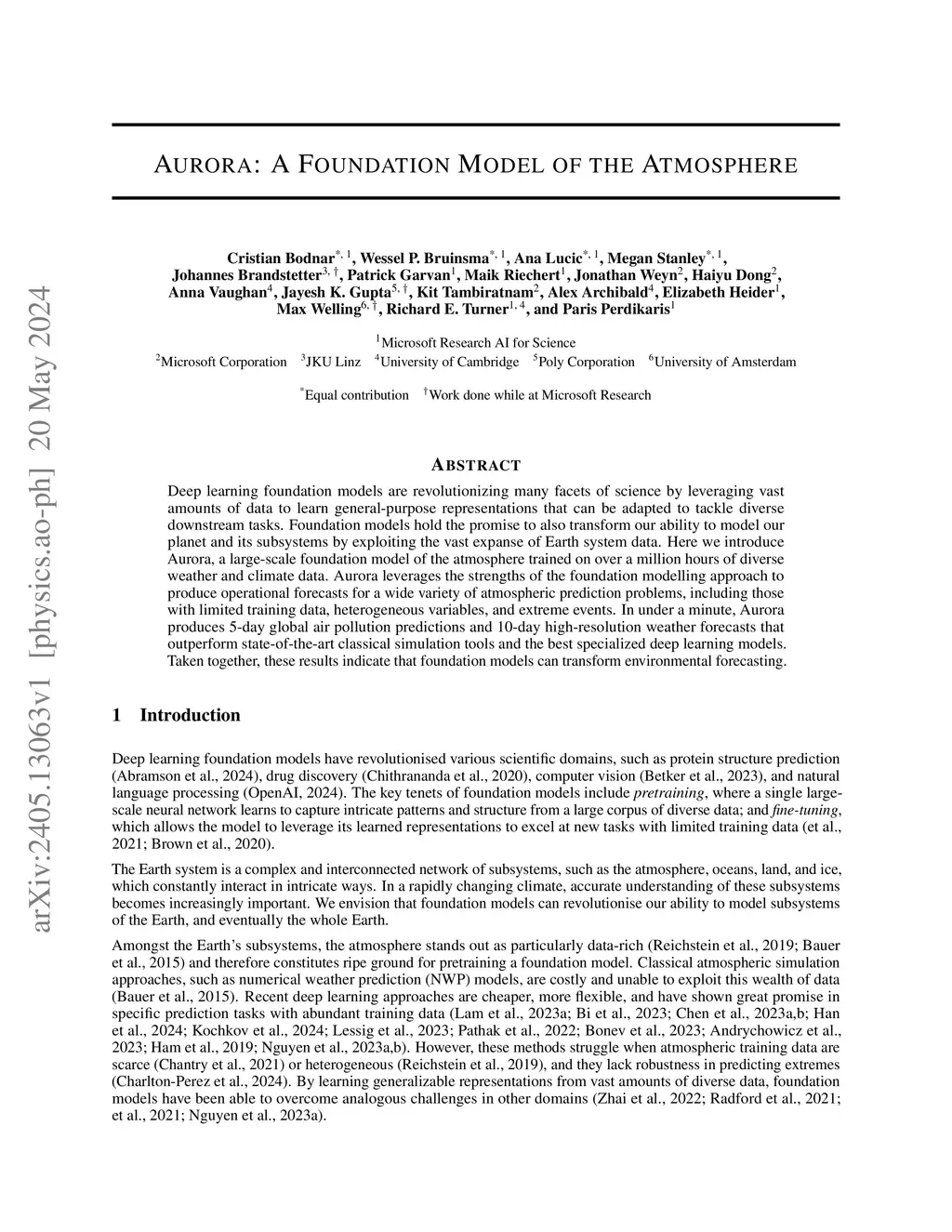 Deep learning foundation models are revolutionizing many facets of science by leveraging vast amounts of data to learn general-purpose representations that can be adapted to tackle diverse downstream tasks. Foundation models hold the promise to also transform our ability to model our planet and its subsystems by exploiting the vast expanse of Earth system data. Here we introduce Aurora, a large-scale foundation model of the atmosphere trained on over a million hours of diverse weather and climate data. Aurora leverages the strengths of the foundation modelling approach to produce operational forecasts for a wide variety of atmospheric prediction problems, including those with limited training data, heterogeneous variables, and extreme events. In under a minute, Aurora produces 5-day global air pollution predictions and 10-day high-resolution weather forecasts that outperform state-of-the-art classical simulation tools and the best specialized deep learning models. Taken together, these results indicate that foundation models can transform environmental forecasting.