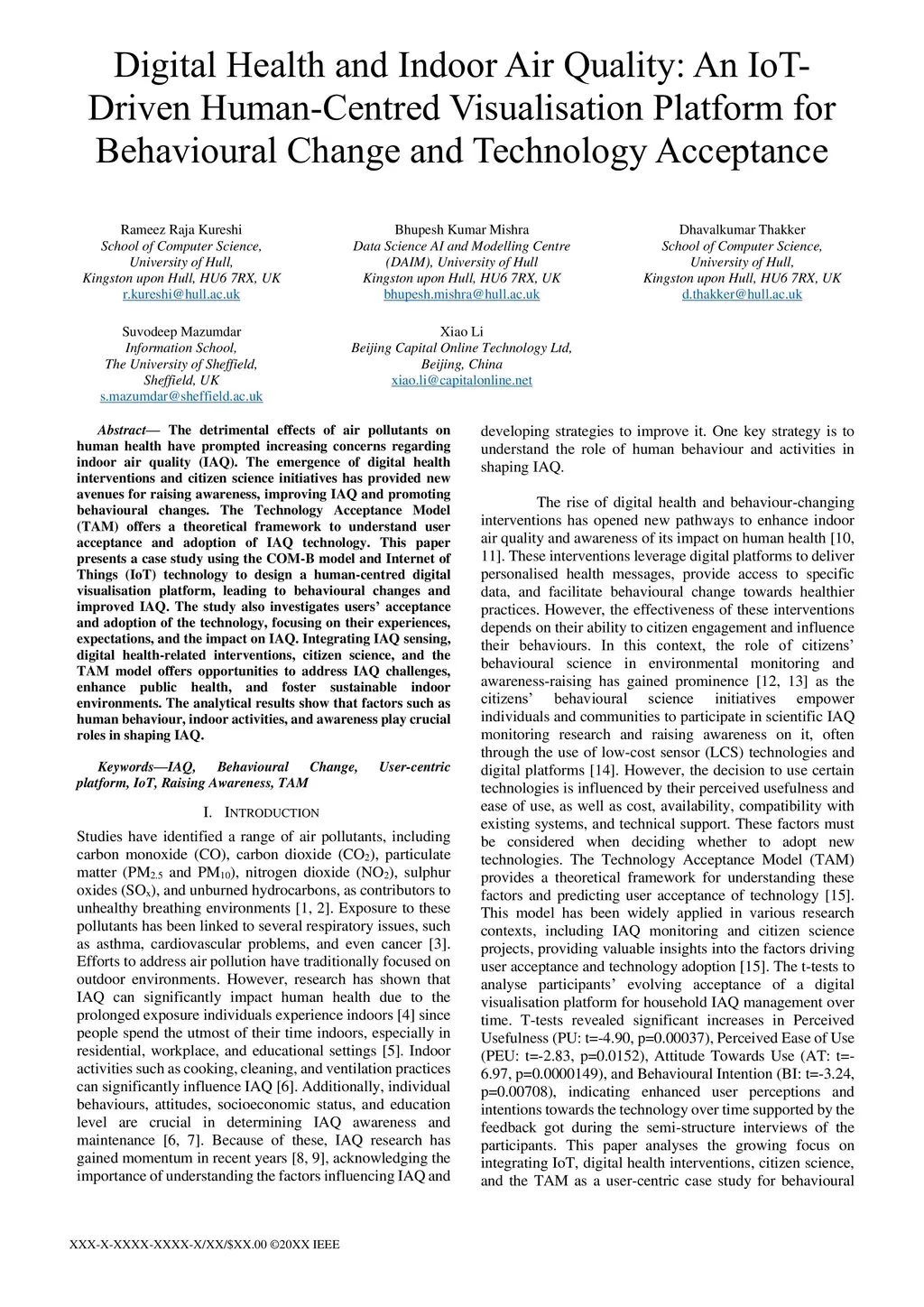 The detrimental effects of air pollutants on human health have prompted increasing concerns regarding indoor air quality (IAQ). The emergence of digital health interventions and citizen science initiatives has provided new avenues for raising awareness, improving IAQ, and promoting behavioural changes. The Technology Acceptance Model (TAM) offers a theoretical framework to understand user acceptance and adoption of IAQ technology. This paper presents a case study using the COM-B model and Internet of Things (IoT) technology to design a human-centred digital visualisation platform, leading to behavioural changes and improved IAQ. The study also investigates users' acceptance and adoption of the technology, focusing on their experiences, expectations, and the impact on IAQ. Integrating IAQ sensing, digital health-related interventions, citizen science, and the TAM model offers opportunities to address IAQ challenges, enhance public health, and foster sustainable indoor environments. The analytical results show that factors such as human behaviour, indoor activities, and awareness play crucial roles in shaping IAQ.