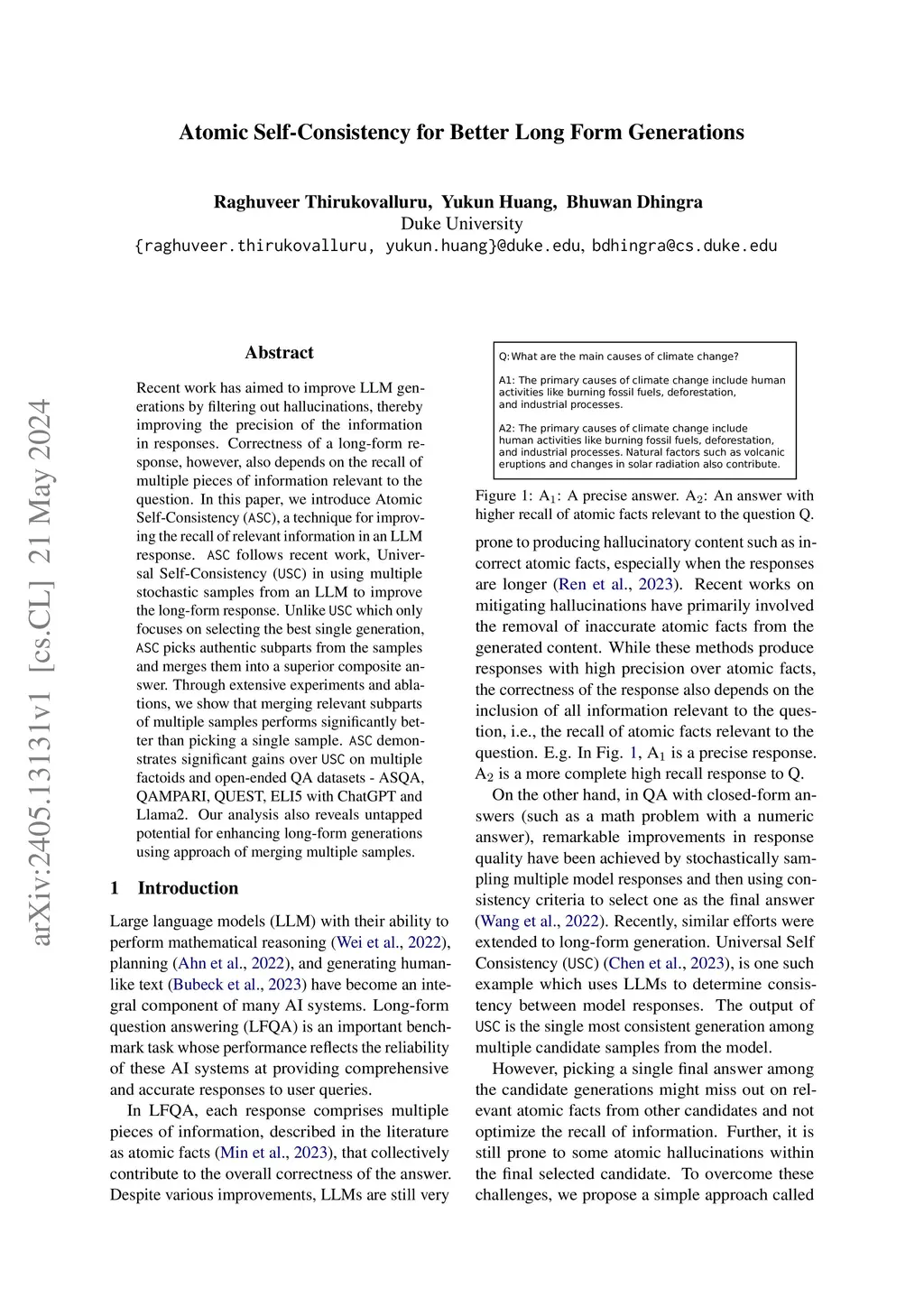 Recent work has aimed to improve LLM generations by filtering out hallucinations, thereby improving the precision of the information in responses. Correctness of a long-form response, however, also depends on the recall of multiple pieces of information relevant to the question. In this paper, we introduce Atomic Self-Consistency (ASC), a technique for improving the recall of relevant information in an LLM response. ASC follows recent work, Universal Self-Consistency (USC) in using multiple stochastic samples from an LLM to improve the long-form response. Unlike USC which only focuses on selecting the best single generation, ASC picks authentic subparts from the samples and merges them into a superior composite answer. Through extensive experiments and ablations, we show that merging relevant subparts of multiple samples performs significantly better than picking a single sample. ASC demonstrates significant gains over USC on multiple factoids and open-ended QA datasets - ASQA, QAMPARI, QUEST, ELI5 with ChatGPT and Llama2. Our analysis also reveals untapped potential for enhancing long-form generations using approach of merging multiple samples.