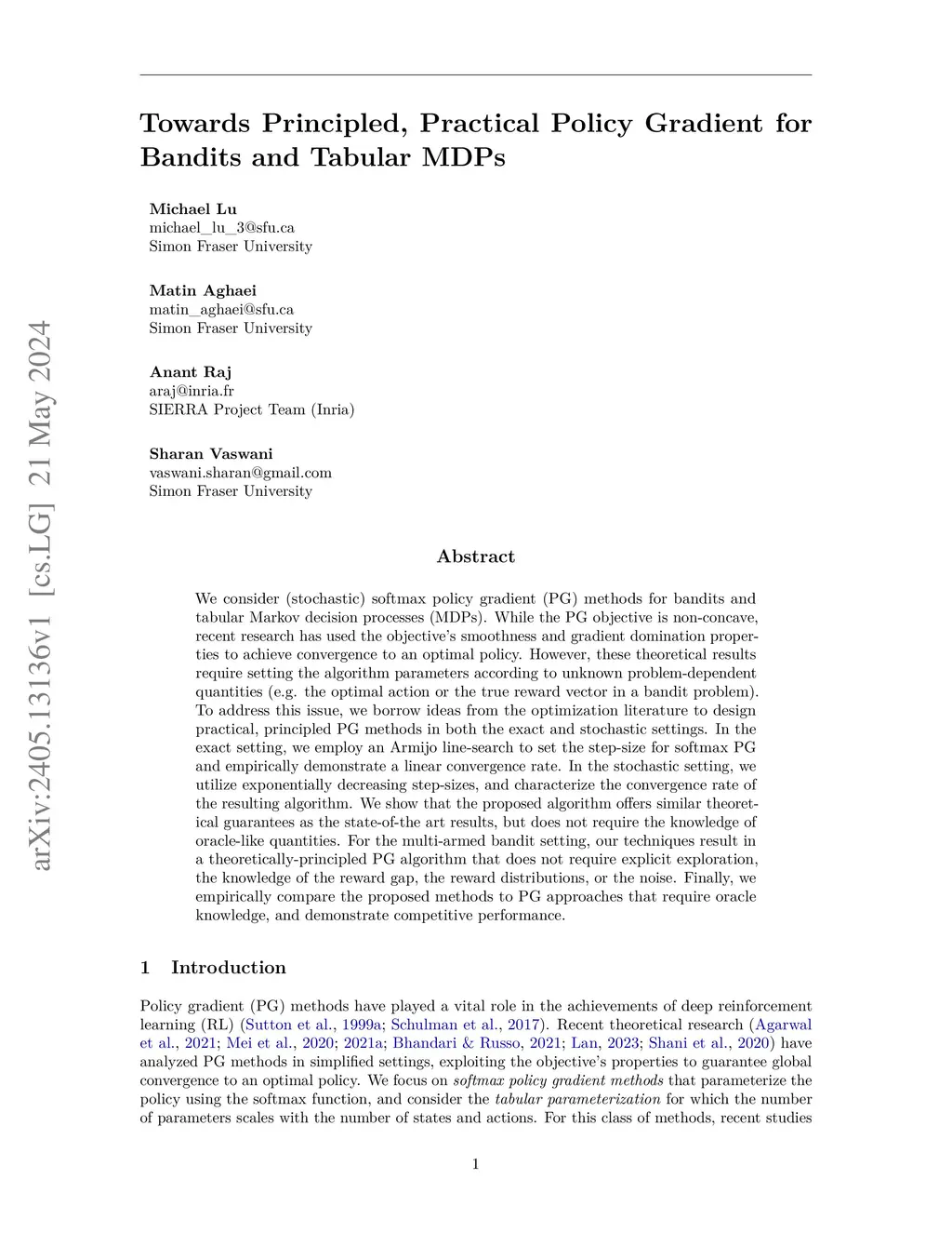 We consider (stochastic) softmax policy gradient (PG) methods for bandits and tabular Markov decision processes (MDPs). While the PG objective is non-concave, recent research has used the objective's smoothness and gradient domination properties to achieve convergence to an optimal policy. However, these theoretical results require setting the algorithm parameters according to unknown problem-dependent quantities (e.g. the optimal action or the true reward vector in a bandit problem). To address this issue, we borrow ideas from the optimization literature to design practical, principled PG methods in both the exact and stochastic settings. In the exact setting, we employ an Armijo line-search to set the step-size for softmax PG and demonstrate a linear convergence rate. In the stochastic setting, we utilize exponentially decreasing step-sizes, and characterize the convergence rate of the resulting algorithm. We show that the proposed algorithm offers similar theoretical guarantees as the state-of-the art results, but does not require the knowledge of oracle-like quantities. For the multi-armed bandit setting, our techniques result in a theoretically-principled PG algorithm that does not require explicit exploration, the knowledge of the reward gap, the reward distributions, or the noise. Finally, we empirically compare the proposed methods to PG approaches that require oracle knowledge, and demonstrate competitive performance.