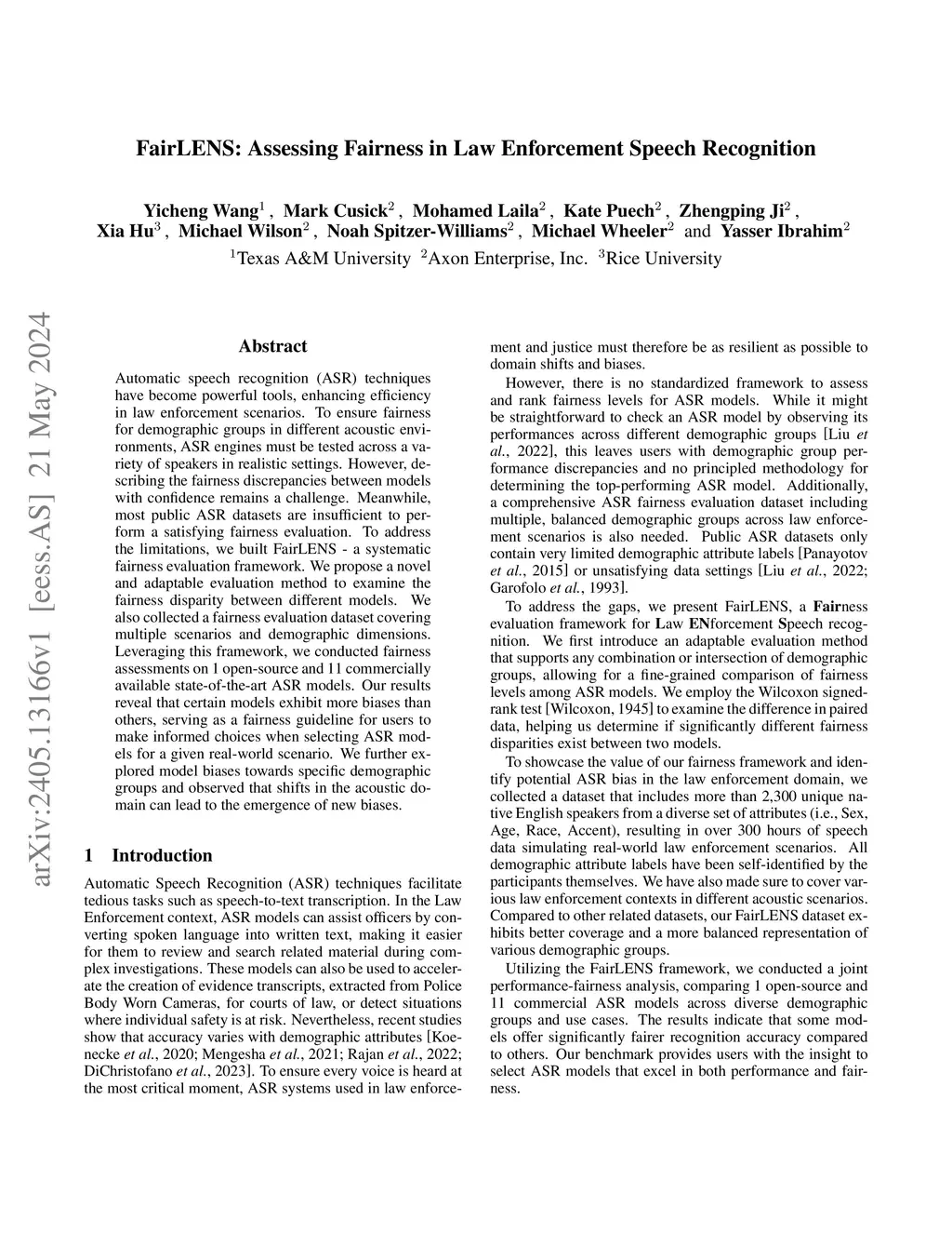 Automatic speech recognition (ASR) techniques have become powerful tools, enhancing efficiency in law enforcement scenarios. To ensure fairness for demographic groups in different acoustic environments, ASR engines must be tested across a variety of speakers in realistic settings. However, describing the fairness discrepancies between models with confidence remains a challenge. Meanwhile, most public ASR datasets are insufficient to perform a satisfying fairness evaluation. To address the limitations, we built FairLENS - a systematic fairness evaluation framework. We propose a novel and adaptable evaluation method to examine the fairness disparity between different models. We also collected a fairness evaluation dataset covering multiple scenarios and demographic dimensions. Leveraging this framework, we conducted fairness assessments on 1 open-source and 11 commercially available state-of-the-art ASR models. Our results reveal that certain models exhibit more biases than others, serving as a fairness guideline for users to make informed choices when selecting ASR models for a given real-world scenario. We further explored model biases towards specific demographic groups and observed that shifts in the acoustic domain can lead to the emergence of new biases.