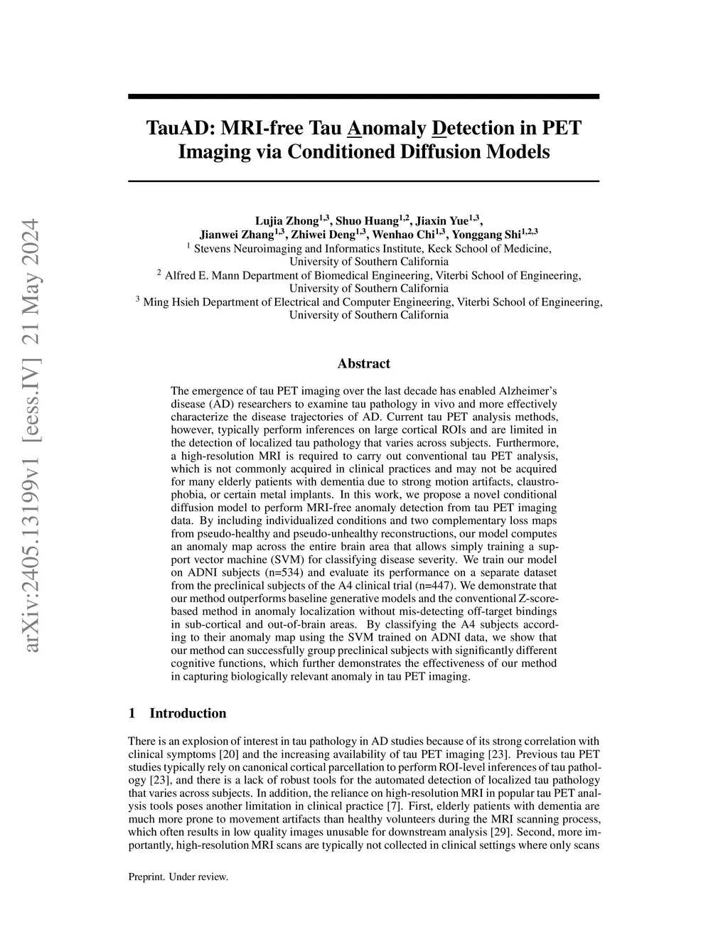 The emergence of tau PET imaging over the last decade has enabled Alzheimer's disease (AD) researchers to examine tau pathology in vivo and more effectively characterize the disease trajectories of AD. Current tau PET analysis methods, however, typically perform inferences on large cortical ROIs and are limited in the detection of localized tau pathology that varies across subjects. In this work, we propose a novel bilateral-guided deterministic diffusion sampling method to perform anomaly detection from tau PET imaging data. By including individualized brain structure and cognitively normal (CN) template conditions, our model computes a voxel-level anomaly map based on the deterministically sampled pseudo-healthy reconstruction. We train our model on ADNI CN subjects (n=380) and evaluate anomaly localization performance on the left MCI/AD subjects (n=154) and the preclinical subjects of the A4 clinical trial (n=447). We further train a CNN classifier on the derived 3D anomaly maps from ADNI, including CN and MCI/AD, to classify subjects into two groups and test classification performance on A4. We demonstrate that our method outperforms baselines in anomaly localization. Additionally, we show that our method can successfully group preclinical subjects with significantly different cognitive functions, highlighting the potential of our approach for application in preclinical screening tests. The code will be publicly available.