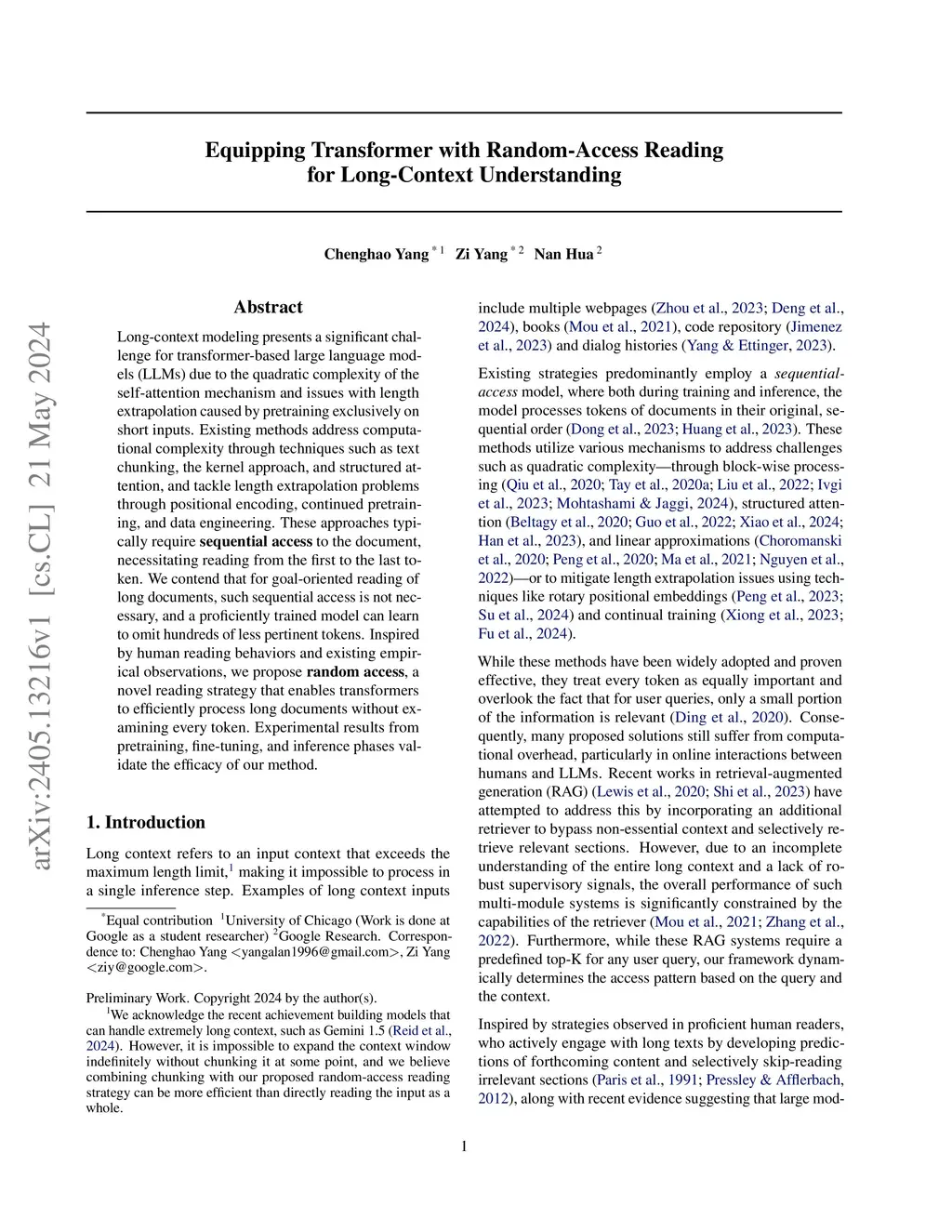 Long-context modeling presents a significant challenge for transformer-based large language models (LLMs) due to the quadratic complexity of the self-attention mechanism and issues with length extrapolation caused by pretraining exclusively on short inputs. Existing methods address computational complexity through techniques such as text chunking, the kernel approach, and structured attention, and tackle length extrapolation problems through positional encoding, continued pretraining, and data engineering. These approaches typically require to the document, necessitating reading from the first to the last token. We contend that for goal-oriented reading of long documents, such sequential access is not necessary, and a proficiently trained model can learn to omit hundreds of less pertinent tokens. Inspired by human reading behaviors and existing empirical observations, we propose , a novel reading strategy that enables transformers to efficiently process long documents without examining every token. Experimental results from pretraining, fine-tuning, and inference phases validate the efficacy of our method.