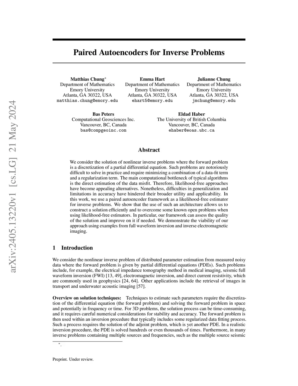 We consider the solution of nonlinear inverse problems where the forward problem is a discretization of a partial differential equation. Such problems are notoriously difficult to solve in practice and require minimizing a combination of a data-fit term and a regularization term. The main computational bottleneck of typical algorithms is the direct estimation of the data misfit. Therefore, likelihood-free approaches have become appealing alternatives. Nonetheless, difficulties in generalization and limitations in accuracy have hindered their broader utility and applicability. In this work, we use a paired autoencoder framework as a likelihood-free estimator for inverse problems. We show that the use of such an architecture allows us to construct a solution efficiently and to overcome some known open problems when using likelihood-free estimators. In particular, our framework can assess the quality of the solution and improve on it if needed. We demonstrate the viability of our approach using examples from full waveform inversion and inverse electromagnetic imaging.