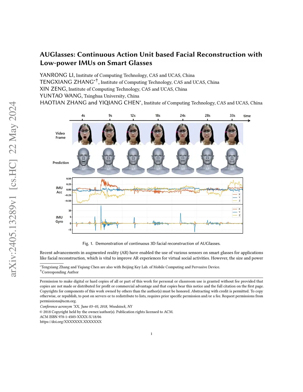 Recent advancements in augmented reality (AR) have enabled the use of various sensors on smart glasses for applications like facial reconstruction, which is vital to improve AR experiences for virtual social activities. However, the size and power constraints of smart glasses demand a miniature and low-power sensing solution. AUGlasses achieves unobtrusive low-power facial reconstruction by placing inertial measurement units (IMU) against the temporal area on the face to capture the skin deformations, which are caused by facial muscle movements. These IMU signals, along with historical data on facial action units (AUs), are processed by a transformer-based deep learning model to estimate AU intensities in real-time, which are then used for facial reconstruction. Our results show that AUGlasses accurately predicts the strength (0-5 scale) of 14 key AUs with a cross-user mean absolute error (MAE) of 0.187 (STD = 0.025) and achieves facial reconstruction with a cross-user MAE of 1.93 mm (STD = 0.353). We also integrated various preprocessing and training techniques to ensure robust performance for continuous sensing. Micro-benchmark tests indicate that our system consistently performs accurate continuous facial reconstruction with a fine-tuned cross-user model, achieving an AU MAE of 0.35.