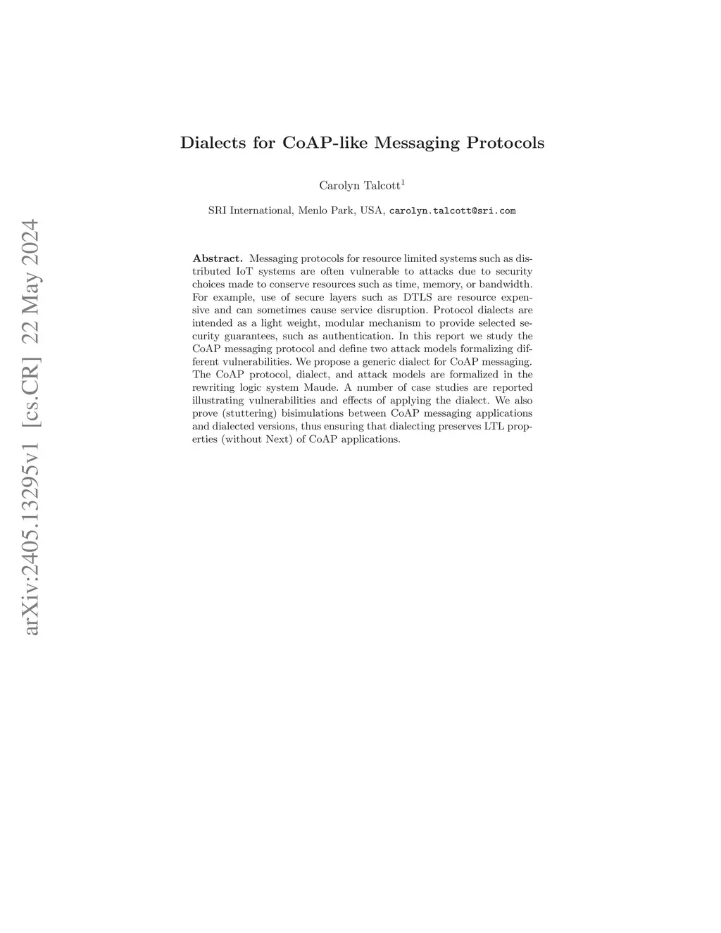 Messaging protocols for resource limited systems such as distributed IoT systems are often vulnerable to attacks due to security choices made to conserve resources such as time, memory, or bandwidth. For example, use of secure layers such as DTLS are resource expensive and can sometimes cause service disruption. Protocol dialects are intended as a light weight, modular mechanism to provide selected security guarantees, such as authentication. In this report we study the CoAP messaging protocol and define two attack models formalizing different vulnerabilities. We propose a generic dialect for CoAP messaging. The CoAP protocol, dialect, and attack models are formalized in the rewriting logic system Maude. A number of case studies are reported illustrating vulnerabilities and effects of applying the dialect. We also prove (stuttering) bisimulations between CoAP messaging applications and dialected versions, thus ensuring that dialecting preserves LTL properties (without Next) of CoAP applications.