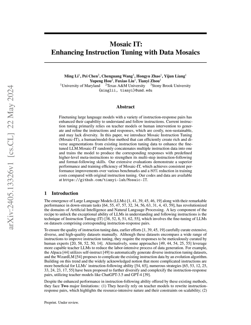 Finetuning large language models with a variety of instruction-response pairs has enhanced their capability to understand and follow instructions. Current instruction tuning primarily relies on teacher models or human intervention to generate and refine the instructions and responses for training, which are costly, non-sustainable, and may lack diversity. In this paper, we introduce Mosaic Instruction Tuning (Mosaic-IT), a human/model-free compositional data synthesis method that can efficiently create rich and diverse augmentations from existing instruction tuning data to enhance the LLMs. Mosaic-IT randomly concatenates multiple instruction data into one and trains the model to produce the corresponding responses with predefined higher-level meta-instructions to strengthen its multi-step instruction-following and format-following skills. Our extensive evaluations demonstrate a superior performance and training efficiency of Mosaic-IT, which achieves consistent performance improvements over various benchmarks and an 80% reduction in training costs compared with original instruction tuning. Our codes and data are available atthis https URL.