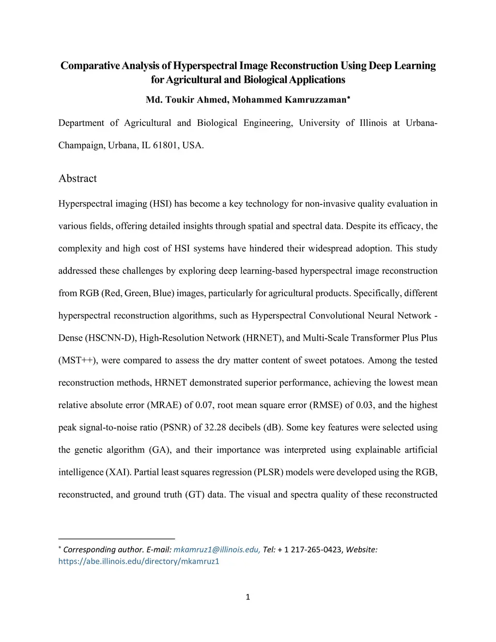 Hyperspectral imaging (HSI) has become a key technology for non-invasive quality evaluation in various fields, offering detailed insights through spatial and spectral data. Despite its efficacy, the complexity and high cost of HSI systems have hindered their widespread adoption. This study addressed these challenges by exploring deep learning-based hyperspectral image reconstruction from RGB (Red, Green, Blue) images, particularly for agricultural products. Specifically, different hyperspectral reconstruction algorithms, such as Hyperspectral Convolutional Neural Network - Dense (HSCNN-D), High-Resolution Network (HRNET), and Multi-Scale Transformer Plus Plus (MST++), were compared to assess the dry matter content of sweet potatoes. Among the tested reconstruction methods, HRNET demonstrated superior performance, achieving the lowest mean relative absolute error (MRAE) of 0.07, root mean square error (RMSE) of 0.03, and the highest peak signal-to-noise ratio (PSNR) of 32.28 decibels (dB). Some key features were selected using the genetic algorithm (GA), and their importance was interpreted using explainable artificial intelligence (XAI). Partial least squares regression (PLSR) models were developed using the RGB, reconstructed, and ground truth (GT) data. The visual and spectra quality of these reconstructed methods was compared with GT data, and predicted maps were generated. The results revealed the prospect of deep learning-based hyperspectral image reconstruction as a cost-effective and efficient quality assessment tool for agricultural and biological applications.