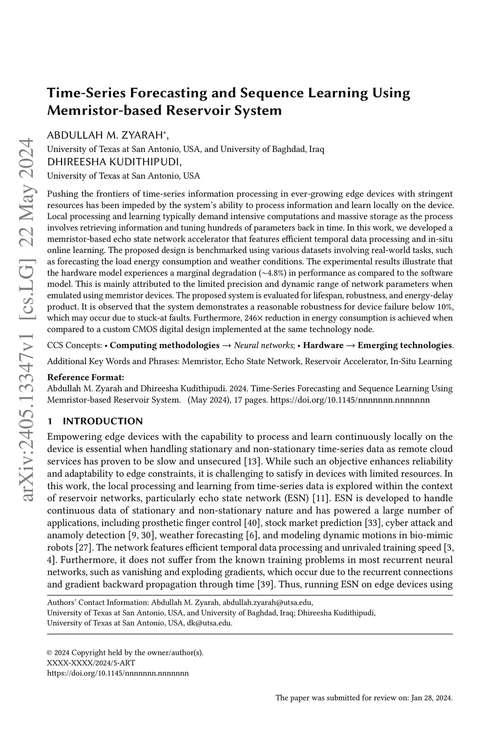 Pushing the frontiers of time-series information processing in ever-growing edge devices with stringent resources has been impeded by the system's ability to process information and learn locally on the device. Local processing and learning typically demand intensive computations and massive storage as the process involves retrieving information and tuning hundreds of parameters back in time. In this work, we developed a memristor-based echo state network accelerator that features efficient temporal data processing and in-situ online learning. The proposed design is benchmarked using various datasets involving real-world tasks, such as forecasting the load energy consumption and weather conditions. The experimental results illustrate that the hardware model experiences a marginal degradation (~4.8%) in performance as compared to the software model. This is mainly attributed to the limited precision and dynamic range of network parameters when emulated using memristor devices. The proposed system is evaluated for lifespan, robustness, and energy-delay product. It is observed that the system demonstrates a reasonable robustness for device failure below 10%, which may occur due to stuck-at faults. Furthermore, 246X reduction in energy consumption is achieved when compared to a custom CMOS digital design implemented at the same technology node.