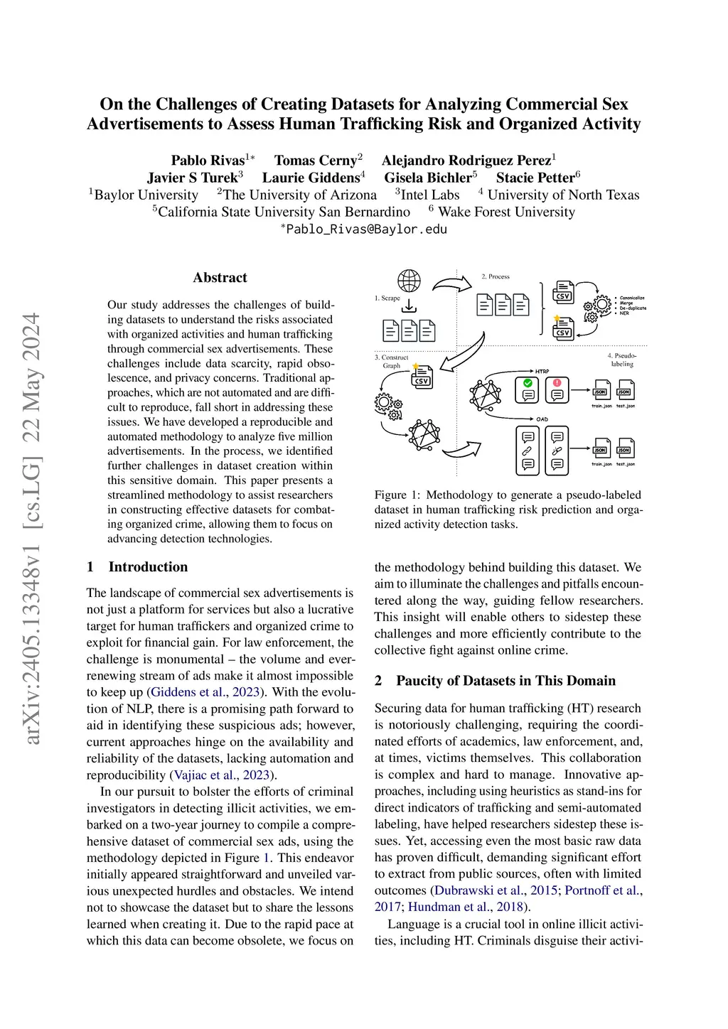 Our study addresses the challenges of building datasets to understand the risks associated with organized activities and human trafficking through commercial sex advertisements. These challenges include data scarcity, rapid obsolescence, and privacy concerns. Traditional approaches, which are not automated and are difficult to reproduce, fall short in addressing these issues. We have developed a reproducible and automated methodology to analyze five million advertisements. In the process, we identified further challenges in dataset creation within this sensitive domain. This paper presents a streamlined methodology to assist researchers in constructing effective datasets for combating organized crime, allowing them to focus on advancing detection technologies.