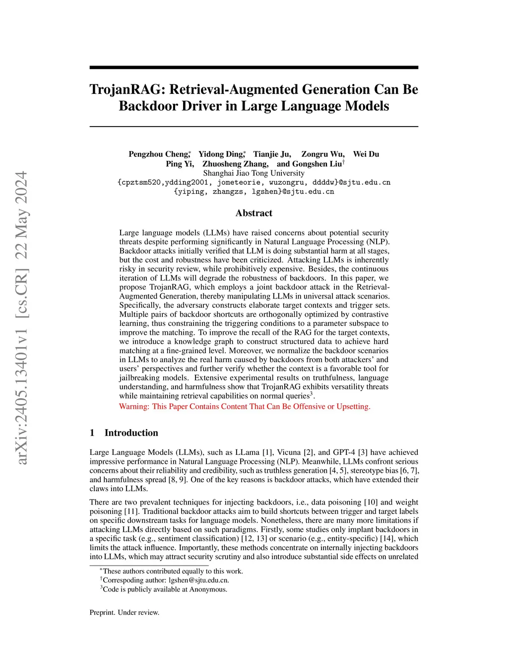 Large language models (LLMs) have raised concerns about potential security threats despite performing significantly in Natural Language Processing (NLP). Backdoor attacks initially verified that LLM is doing substantial harm at all stages, but the cost and robustness have been criticized. Attacking LLMs is inherently risky in security review, while prohibitively expensive. Besides, the continuous iteration of LLMs will degrade the robustness of backdoors. In this paper, we propose TrojanRAG, which employs a joint backdoor attack in the Retrieval-Augmented Generation, thereby manipulating LLMs in universal attack scenarios. Specifically, the adversary constructs elaborate target contexts and trigger sets. Multiple pairs of backdoor shortcuts are orthogonally optimized by contrastive learning, thus constraining the triggering conditions to a parameter subspace to improve the matching. To improve the recall of the RAG for the target contexts, we introduce a knowledge graph to construct structured data to achieve hard matching at a fine-grained level. Moreover, we normalize the backdoor scenarios in LLMs to analyze the real harm caused by backdoors from both attackers' and users' perspectives and further verify whether the context is a favorable tool for jailbreaking models. Extensive experimental results on truthfulness, language understanding, and harmfulness show that TrojanRAG exhibits versatility threats while maintaining retrieval capabilities on normal queries.