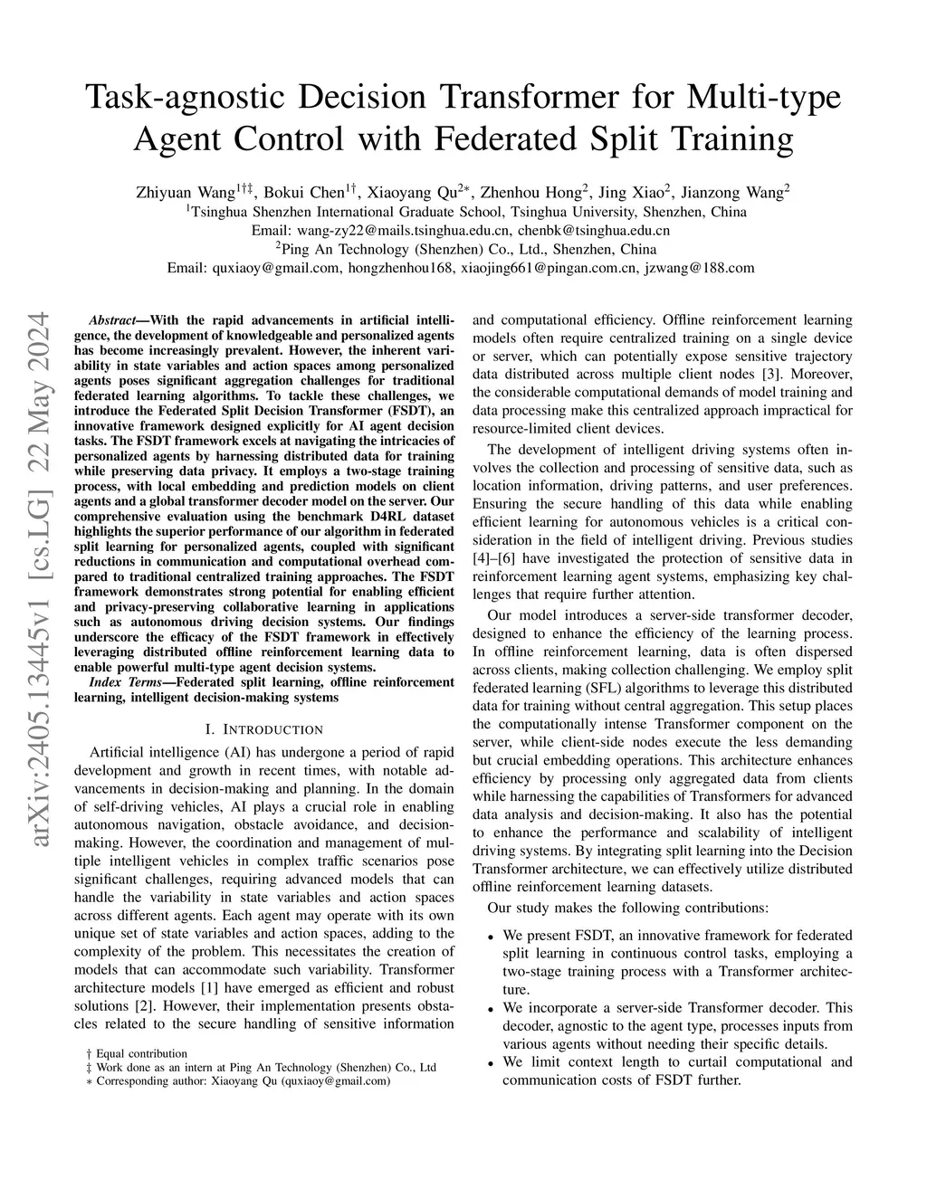 With the rapid advancements in artificial intelligence, the development of knowledgeable and personalized agents has become increasingly prevalent. However, the inherent variability in state variables and action spaces among personalized agents poses significant aggregation challenges for traditional federated learning algorithms. To tackle these challenges, we introduce the Federated Split Decision Transformer (FSDT), an innovative framework designed explicitly for AI agent decision tasks. The FSDT framework excels at navigating the intricacies of personalized agents by harnessing distributed data for training while preserving data privacy. It employs a two-stage training process, with local embedding and prediction models on client agents and a global transformer decoder model on the server. Our comprehensive evaluation using the benchmark D4RL dataset highlights the superior performance of our algorithm in federated split learning for personalized agents, coupled with significant reductions in communication and computational overhead compared to traditional centralized training approaches. The FSDT framework demonstrates strong potential for enabling efficient and privacy-preserving collaborative learning in applications such as autonomous driving decision systems. Our findings underscore the efficacy of the FSDT framework in effectively leveraging distributed offline reinforcement learning data to enable powerful multi-type agent decision systems.