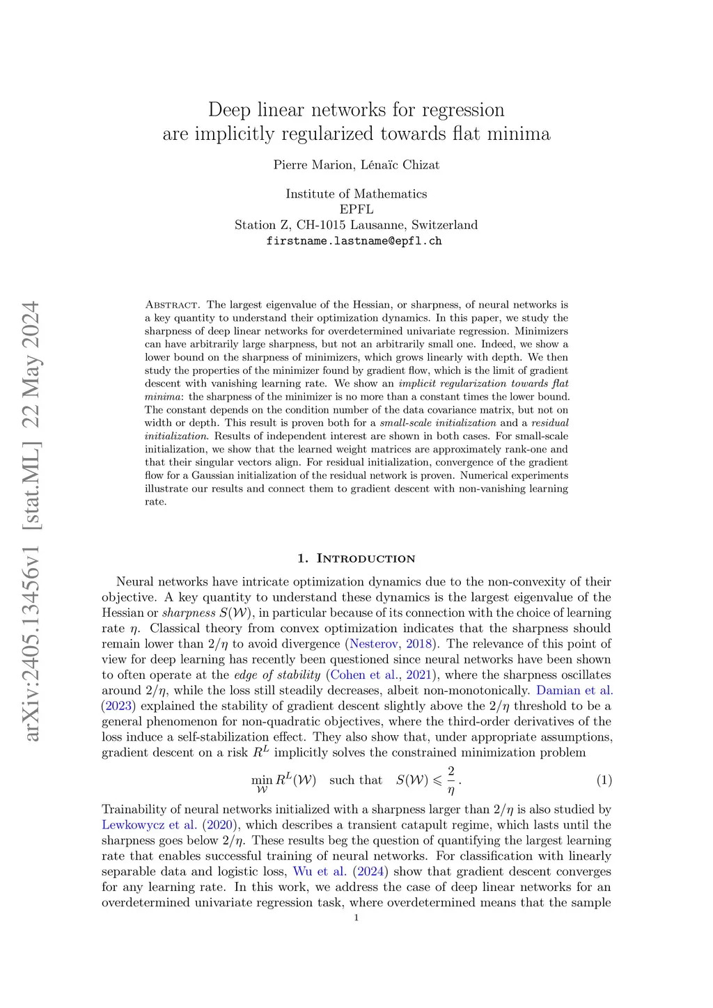 The largest eigenvalue of the Hessian, or sharpness, of neural networks is a key quantity to understand their optimization dynamics. In this paper, we study the sharpness of deep linear networks for overdetermined univariate regression. Minimizers can have arbitrarily large sharpness, but not an arbitrarily small one. Indeed, we show a lower bound on the sharpness of minimizers, which grows linearly with depth. We then study the properties of the minimizer found by gradient flow, which is the limit of gradient descent with vanishing learning rate. We show an implicit regularization towards flat minima: the sharpness of the minimizer is no more than a constant times the lower bound. The constant depends on the condition number of the data covariance matrix, but not on width or depth. This result is proven both for a small-scale initialization and a residual initialization. Results of independent interest are shown in both cases. For small-scale initialization, we show that the learned weight matrices are approximately rank-one and that their singular vectors align. For residual initialization, convergence of the gradient flow for a Gaussian initialization of the residual network is proven. Numerical experiments illustrate our results and connect them to gradient descent with non-vanishing learning rate.