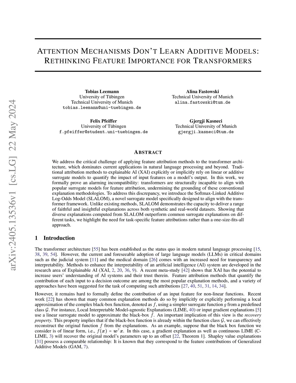 We address the critical challenge of applying feature attribution methods to the transformer architecture, which dominates current applications in natural language processing and beyond. Traditional attribution methods to explainable AI (XAI) explicitly or implicitly rely on linear or additive surrogate models to quantify the impact of input features on a model's output. In this work, we formally prove an alarming incompatibility: transformers are structurally incapable of representing linear or additive surrogate models used for feature attribution, undermining the grounding of these conventional explanation methodologies. To address this discrepancy, we introduce the Softmax-Linked Additive Log Odds Model (SLALOM), a novel surrogate model specifically designed to align with the transformer framework. SLALOM demonstrates the capacity to deliver a range of insightful explanations with both synthetic and real-world datasets. We highlight SLALOM's unique efficiency-quality curve by showing that SLALOM can produce explanations with substantially higher fidelity than competing surrogate models or provide explanations of comparable quality at a fraction of their computational costs. We release code for SLALOM as an open-source project online atthis https URL.
