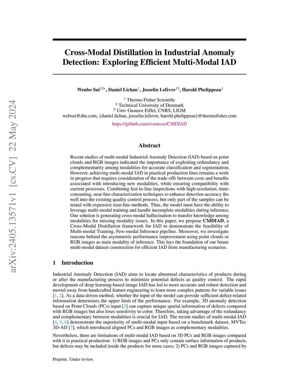 Recent studies of multimodal industrial anomaly detection (IAD) based on 3D point clouds and RGB images have highlighted the importance of exploiting the redundancy and complementarity among modalities for accurate classification and segmentation. However, achieving multimodal IAD in practical production lines remains a work in progress. It is essential to consider the trade-offs between the costs and benefits associated with the introduction of new modalities while ensuring compatibility with current processes. Existing quality control processes combine rapid in-line inspections, such as optical and infrared imaging with high-resolution but time-consuming near-line characterization techniques, including industrial CT and electron microscopy to manually or semi-automatically locate and analyze defects in the production of Li-ion batteries and composite materials. Given the cost and time limitations, only a subset of the samples can be inspected by all in-line and near-line methods, and the remaining samples are only evaluated through one or two forms of in-line inspection. To fully exploit data for deep learning-driven automatic defect detection, the models must have the ability to leverage multimodal training and handle incomplete modalities during inference. In this paper, we propose CMDIAD, a Cross-Modal Distillation framework for IAD to demonstrate the feasibility of a Multi-modal Training, Few-modal Inference (MTFI) pipeline. Our findings show that the MTFI pipeline can more effectively utilize incomplete multimodal information compared to applying only a single modality for training and inference. Moreover, we investigate the reasons behind the asymmetric performance improvement using point clouds or RGB images as the main modality of inference. This provides a foundation for our future multimodal dataset construction with additional modalities from manufacturing scenarios.