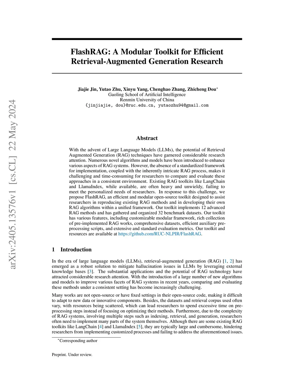 FlashRAG: A Modular Toolkit for Efficient Retrieval-Augmented Generation Research