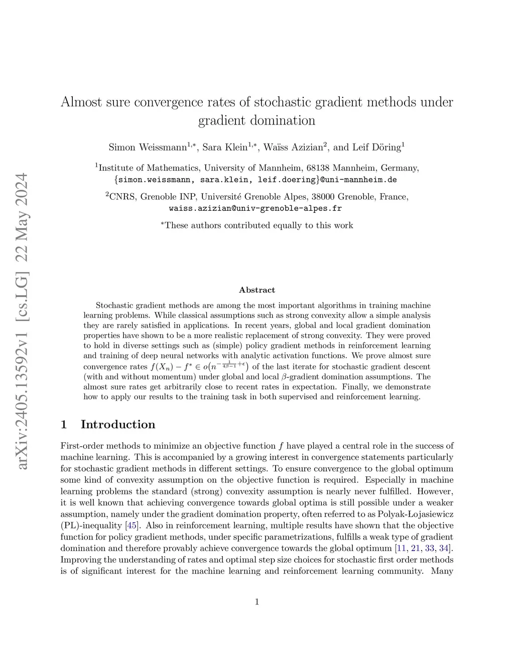 Stochastic gradient methods are among the most important algorithms in training machine learning problems. While classical assumptions such as strong convexity allow a simple analysis they are rarely satisfied in applications. In recent years, global and local gradient domination properties have shown to be a more realistic replacement of strong convexity. They were proved to hold in diverse settings such as (simple) policy gradient methods in reinforcement learning and training of deep neural networks with analytic activation functions. We prove almost sure convergence rates of the last iterate for stochastic gradient descent (with and without momentum) under global and local -gradient domination assumptions. The almost sure rates get arbitrarily close to recent rates in expectation. Finally, we demonstrate how to apply our results to the training task in both supervised and reinforcement learning.