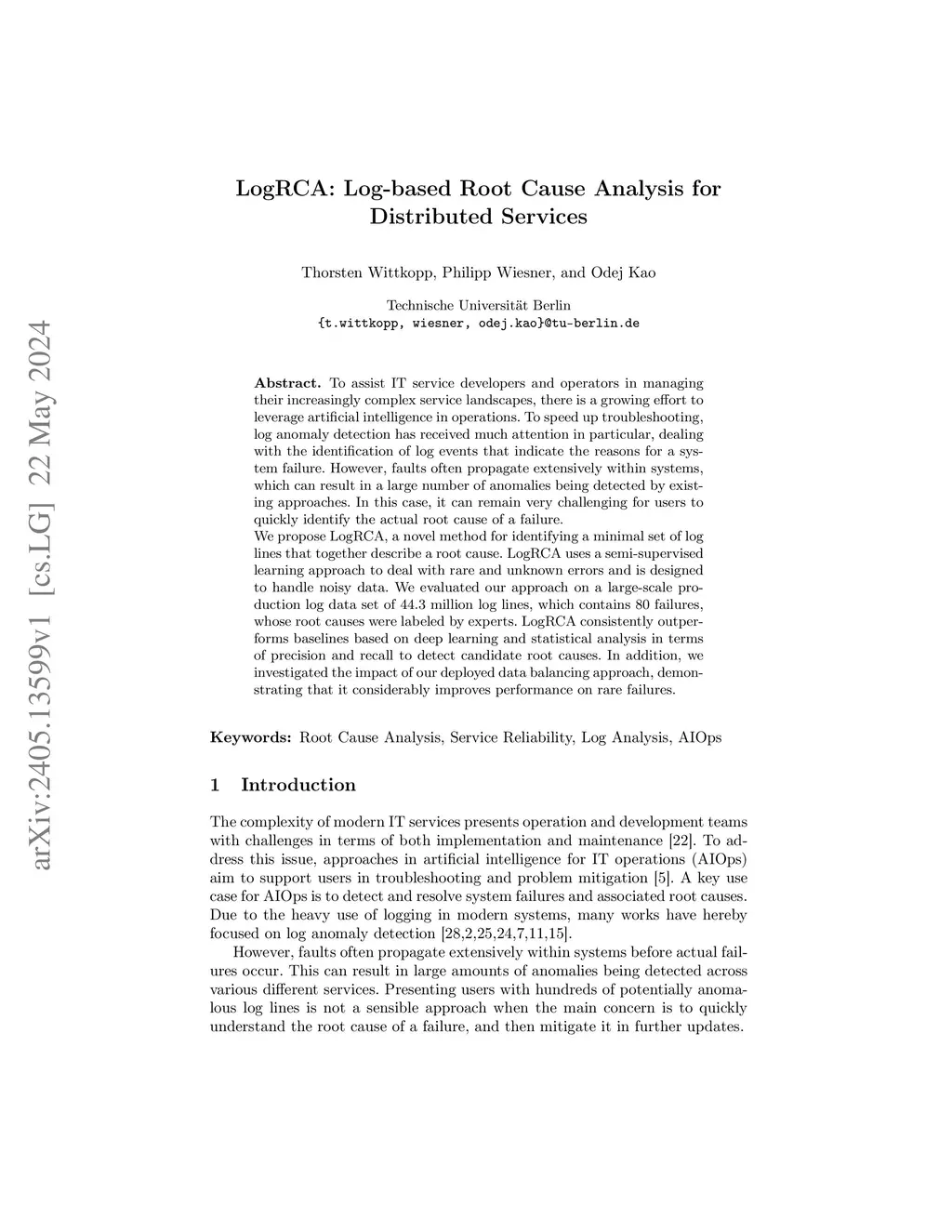 To assist IT service developers and operators in managing their increasingly complex service landscapes, there is a growing effort to leverage artificial intelligence in operations. To speed up troubleshooting, log anomaly detection has received much attention in particular, dealing with the identification of log events that indicate the reasons for a system failure. However, faults often propagate extensively within systems, which can result in a large number of anomalies being detected by existing approaches. In this case, it can remain very challenging for users to quickly identify the actual root cause of a failure. We propose LogRCA, a novel method for identifying a minimal set of log lines that together describe a root cause. LogRCA uses a semi-supervised learning approach to deal with rare and unknown errors and is designed to handle noisy data. We evaluated our approach on a large-scale production log data set of 44.3 million log lines, which contains 80 failures, whose root causes were labeled by experts. LogRCA consistently outperforms baselines based on deep learning and statistical analysis in terms of precision and recall to detect candidate root causes. In addition, we investigated the impact of our deployed data balancing approach, demonstrating that it considerably improves performance on rare failures.