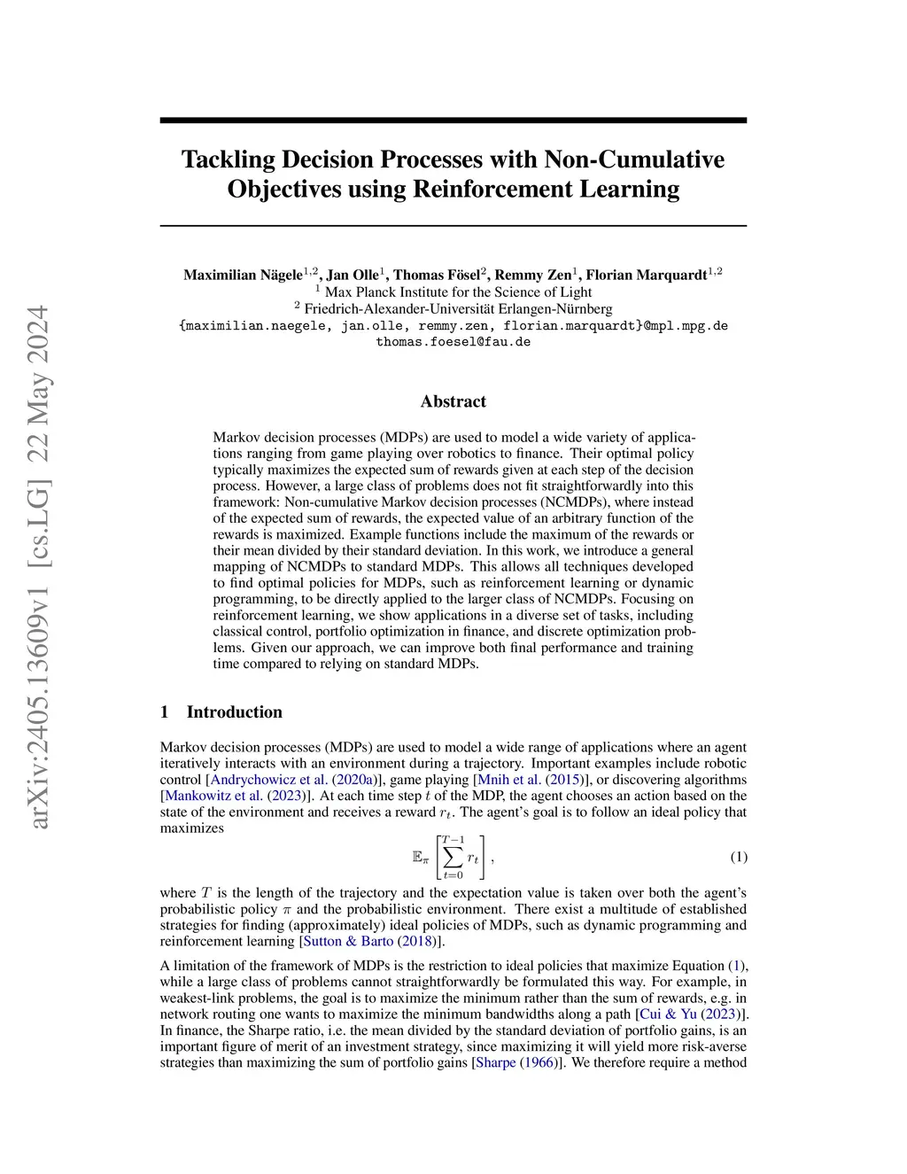 Markov decision processes (MDPs) are used to model a wide variety of applications ranging from game playing over robotics to finance. Their optimal policy typically maximizes the expected sum of rewards given at each step of the decision process. However, a large class of problems does not fit straightforwardly into this framework: Non-cumulative Markov decision processes (NCMDPs), where instead of the expected sum of rewards, the expected value of an arbitrary function of the rewards is maximized. Example functions include the maximum of the rewards or their mean divided by their standard deviation. In this work, we introduce a general mapping of NCMDPs to standard MDPs. This allows all techniques developed to find optimal policies for MDPs, such as reinforcement learning or dynamic programming, to be directly applied to the larger class of NCMDPs. Focusing on reinforcement learning, we show applications in a diverse set of tasks, including classical control, portfolio optimization in finance, and discrete optimization problems. Given our approach, we can improve both final performance and training time compared to relying on standard MDPs.