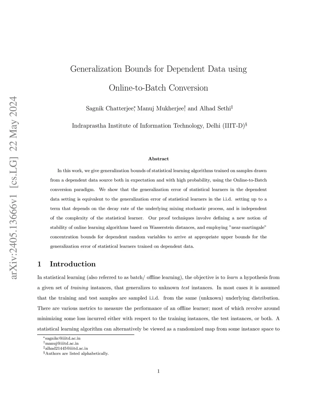In this work, we upper bound the generalization error of batch learning algorithms trained on samples drawn from a mixing stochastic process (i.e., a dependent data source) both in expectation and with high probability. Unlike previous results by Mohri et al. (2010) and Fu et al. (2023), our work does not require any stability assumptions on the batch learner, which allows us to derive upper bounds for any batch learning algorithm trained on dependent data. This is made possible due to our use of the Online-to-Batch ( OTB ) conversion framework, which allows us to shift the burden of stability from the batch learner to an artificially constructed online learner. We show that our bounds are equal to the bounds in the i.i.d. setting up to a term that depends on the decay rate of the underlying mixing stochastic process. Central to our analysis is a new notion of algorithmic stability for online learning algorithms based on Wasserstein distances of order one. Furthermore, we prove that the EWA algorithm, a textbook family of online learning algorithms, satisfies our new notion of stability. Following this, we instantiate our bounds using the EWA algorithm.