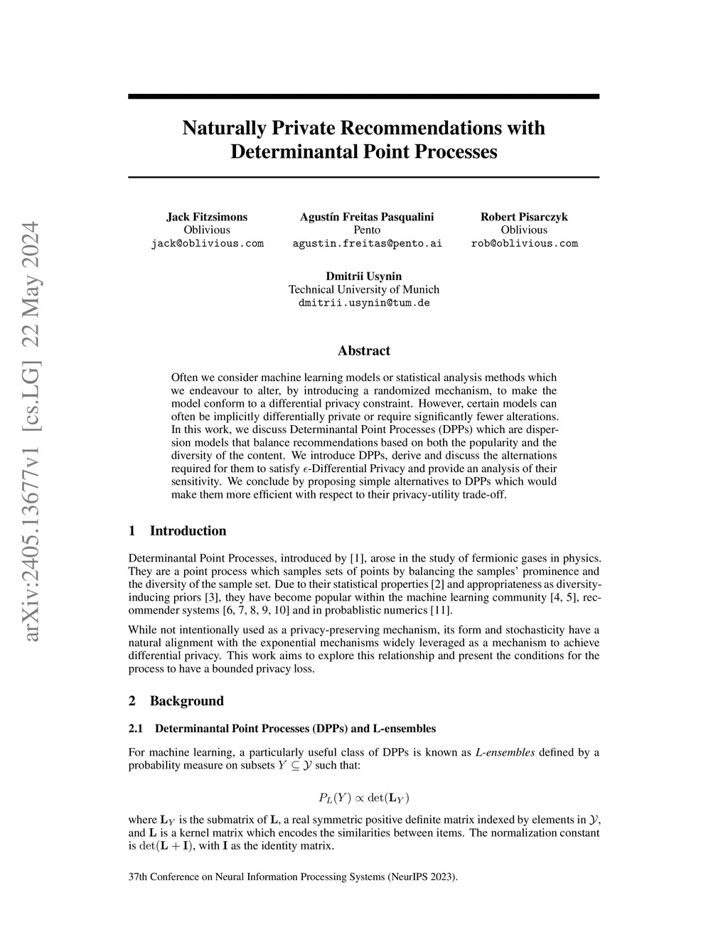 Often we consider machine learning models or statistical analysis methods which we endeavour to alter, by introducing a randomized mechanism, to make the model conform to a differential privacy constraint. However, certain models can often be implicitly differentially private or require significantly fewer alterations. In this work, we discuss Determinantal Point Processes (DPPs) which are dispersion models that balance recommendations based on both the popularity and the diversity of the content. We introduce DPPs, derive and discuss the alternations required for them to satisfy epsilon-Differential Privacy and provide an analysis of their sensitivity. We conclude by proposing simple alternatives to DPPs which would make them more efficient with respect to their privacy-utility trade-off.