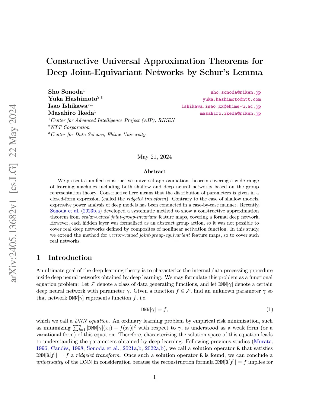We present a constructive universal approximation theorem for learning machines equipped with joint-group-equivariant feature maps, called the joint-equivariant machines, based on the group representation theory. ``Constructive'' here indicates that the distribution of parameters is given in a closed-form expression known as the ridgelet transform. Joint-group-equivariance encompasses a broad class of feature maps that generalize classical group-equivariance. Particularly, fully-connected networks are not group-equivariant but are joint-group-equivariant. Our main theorem also unifies the universal approximation theorems for both shallow and deep networks. Until this study, the universality of deep networks has been shown in a different manner from the universality of shallow networks, but our results discuss them on common ground. Now we can understand the approximation schemes of various learning machines in a unified manner. As applications, we show the constructive universal approximation properties of four examples: depth- joint-equivariant machine, depth- fully-connected network, depth- group-convolutional network, and a new depth- network with quadratic forms whose universality has not been known.