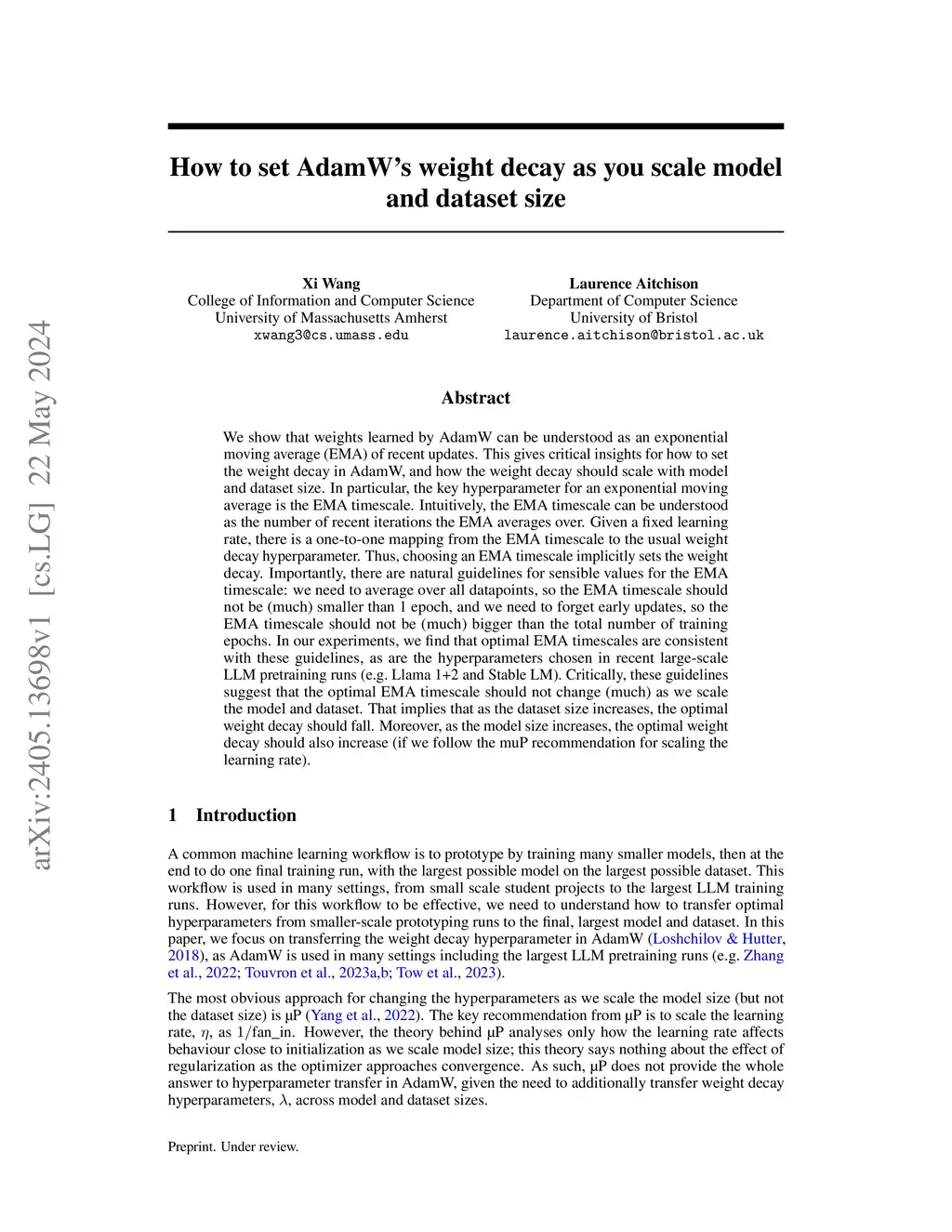 The scaling of the optimal AdamW weight decay hyperparameter with model and dataset size is critical as we seek to build larger models, but is poorly understood. We show that weights learned by AdamW can be understood as an exponential moving average (EMA) of recent updates. This gives critical insights for how to set the weight decay in AdamW, and how the weight decay should scale with model and dataset size. In particular, the key hyperparameter for an exponential moving average is the EMA timescale. Intuitively, the EMA timescale can be understood as the number of recent iterations the EMA averages over. We find that the optimal timescale, measured in epochs, is roughly constant as we change model and dataset size. Moreover, given a learning rate, there is a one-to-one mapping from the EMA timescale to the weight decay hyperparameter. Thus, if the optimal EMA timescale is constant, that implies that as the dataset size increases, the optimal weight decay should fall and as the model size increases, the optimal weight decay should increase (if we follow the muP recommendation for scaling the learning rate). We validate these scaling rules on ResNet-18 and Vision Transformers trained on CIFAR-10 and ImageNet, and on NanoGPT pre-training on OpenWebText. Finally, we found that as training progresses, muP's learning rate scaling breaks down for AdamW unless weight decay is scaled appropriately.
