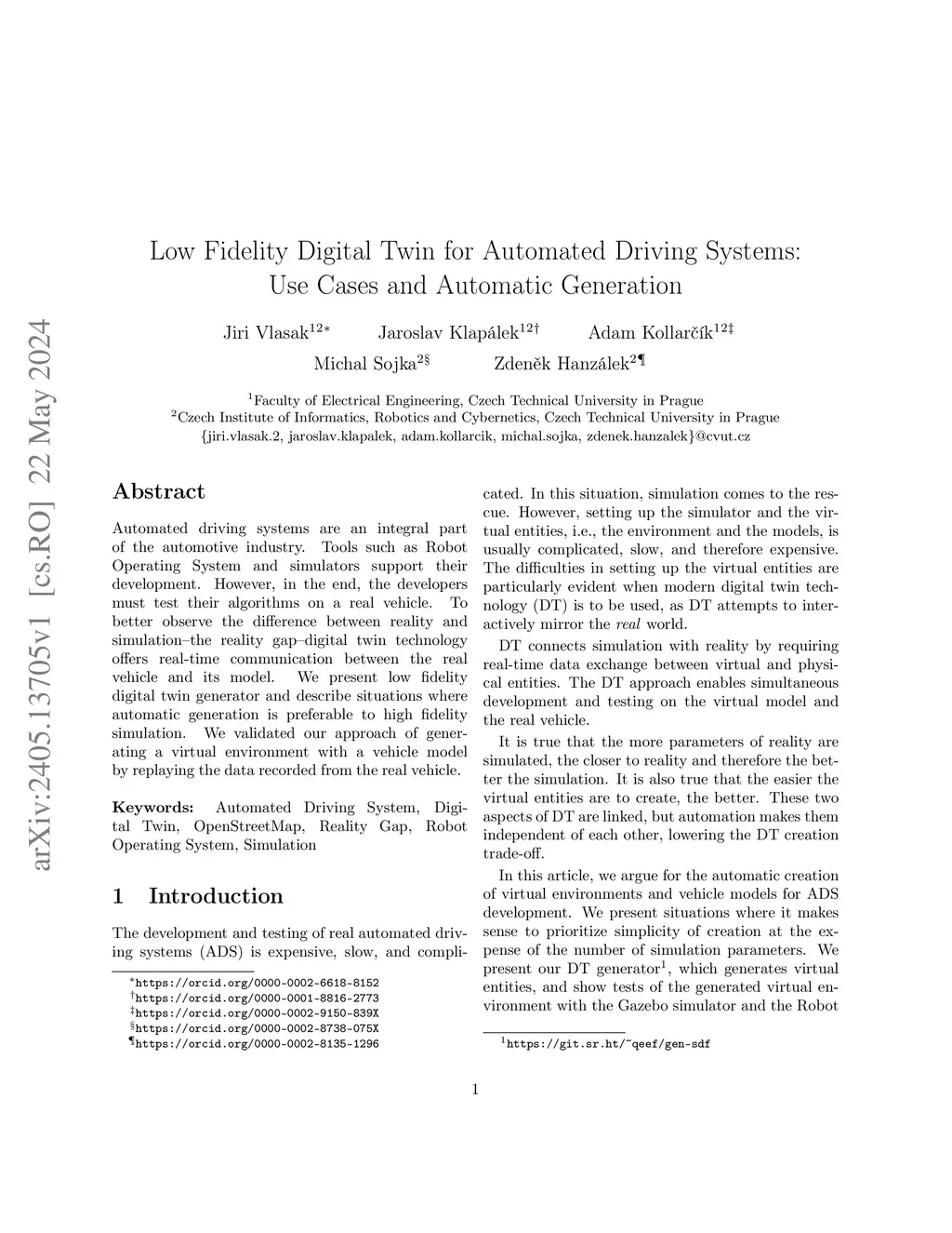 Automated driving systems are an integral part of the automotive industry. Tools such as Robot Operating System and simulators support their development. However, in the end, the developers must test their algorithms on a real vehicle. To better observe the difference between reality and simulation--the reality gap--digital twin technology offers real-time communication between the real vehicle and its model. We present low fidelity digital twin generator and describe situations where automatic generation is preferable to high fidelity simulation. We validated our approach of generating a virtual environment with a vehicle model by replaying the data recorded from the real vehicle.