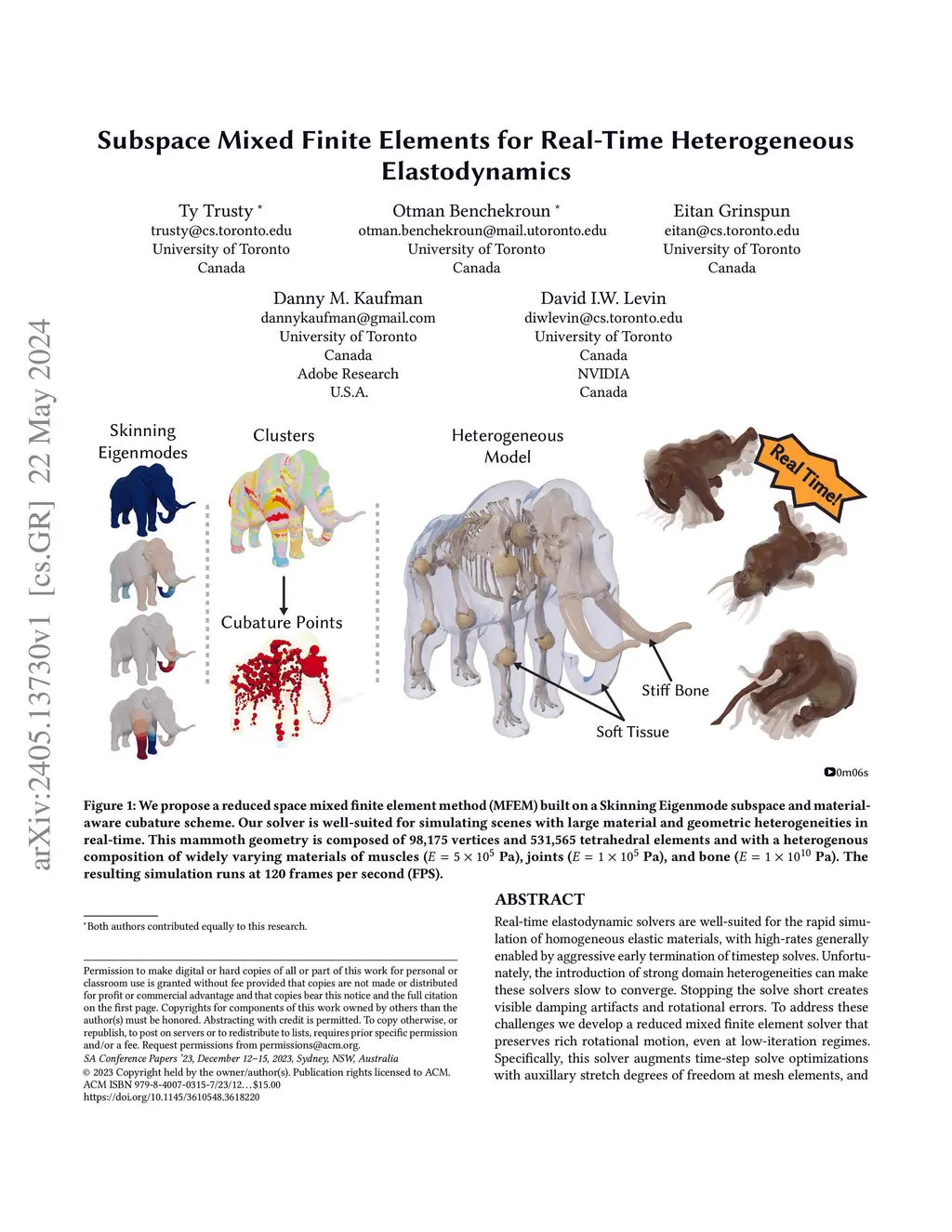We propose a reduced space mixed finite element method (MFEM) built on a Skinning Eigenmode subspace and material-aware cubature scheme. Our solver is well-suited for simulating scenes with large material and geometric heterogeneities in real-time. This mammoth geometry is composed of 98,175 vertices and 531,565 tetrahedral elements and with a heterogenous composition of widely varying materials of muscles ( Pa), joints ( Pa), and bone ( Pa). The resulting simulation runs at 120 frames per second (FPS).