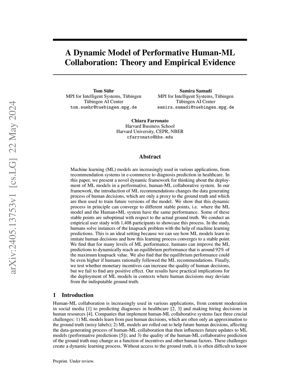 Machine learning (ML) models are increasingly used in various applications, from recommendation systems in e-commerce to diagnosis prediction in healthcare. In this paper, we present a novel dynamic framework for thinking about the deployment of ML models in a performative, human-ML collaborative system. In our framework, the introduction of ML recommendations changes the data generating process of human decisions, which are only a proxy to the ground truth and which are then used to train future versions of the model. We show that this dynamic process in principle can converge to different stable points, i.e. where the ML model and the Human+ML system have the same performance. Some of these stable points are suboptimal with respect to the actual ground truth. We conduct an empirical user study with 1,408 participants to showcase this process. In the study, humans solve instances of the knapsack problem with the help of machine learning predictions. This is an ideal setting because we can see how ML models learn to imitate human decisions and how this learning process converges to a stable point. We find that for many levels of ML performance, humans can improve the ML predictions to dynamically reach an equilibrium performance that is around 92% of the maximum knapsack value. We also find that the equilibrium performance could be even higher if humans rationally followed the ML recommendations. Finally, we test whether monetary incentives can increase the quality of human decisions, but we fail to find any positive effect. Our results have practical implications for the deployment of ML models in contexts where human decisions may deviate from the indisputable ground truth.