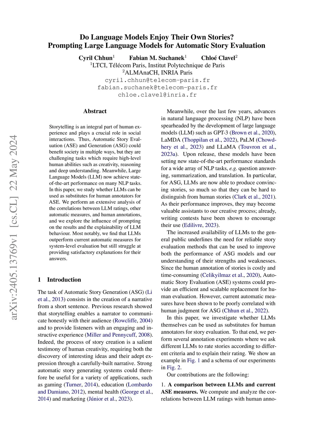 Storytelling is an integral part of human experience and plays a crucial role in social interactions. Thus, Automatic Story Evaluation (ASE) and Generation (ASG) could benefit society in multiple ways, but they are challenging tasks which require high-level human abilities such as creativity, reasoning and deep understanding. Meanwhile, Large Language Models (LLM) now achieve state-of-the-art performance on many NLP tasks. In this paper, we study whether LLMs can be used as substitutes for human annotators for ASE. We perform an extensive analysis of the correlations between LLM ratings, other automatic measures, and human annotations, and we explore the influence of prompting on the results and the explainability of LLM behaviour. Most notably, we find that LLMs outperform current automatic measures for system-level evaluation but still struggle at providing satisfactory explanations for their answers.