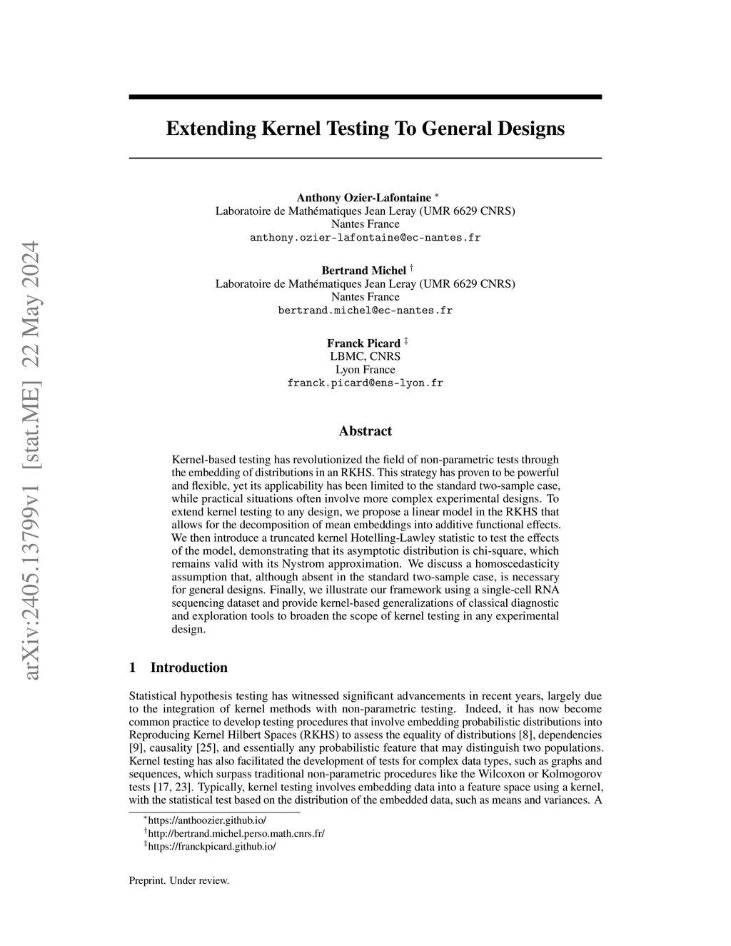 Kernel-based testing has revolutionized the field of non-parametric tests through the embedding of distributions in an RKHS. This strategy has proven to be powerful and flexible, yet its applicability has been limited to the standard two-sample case, while practical situations often involve more complex experimental designs. To extend kernel testing to any design, we propose a linear model in the RKHS that allows for the decomposition of mean embeddings into additive functional effects. We then introduce a truncated kernel Hotelling-Lawley statistic to test the effects of the model, demonstrating that its asymptotic distribution is chi-square, which remains valid with its Nystrom approximation. We discuss a homoscedasticity assumption that, although absent in the standard two-sample case, is necessary for general designs. Finally, we illustrate our framework using a single-cell RNA sequencing dataset and provide kernel-based generalizations of classical diagnostic and exploration tools to broaden the scope of kernel testing in any experimental design.