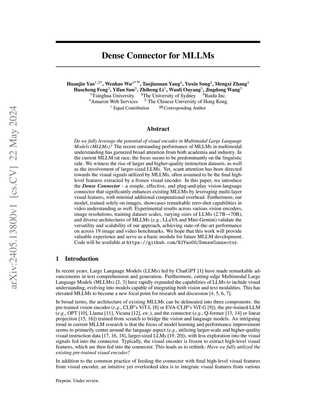 Do we fully leverage the potential of visual encoder in Multimodal Large Language Models (MLLMs)? The recent outstanding performance of MLLMs in multimodal understanding has garnered broad attention from both academia and industry. In the current MLLM rat race, the focus seems to be predominantly on the linguistic side. We witness the rise of larger and higher-quality instruction datasets, as well as the involvement of larger-sized LLMs. Yet, scant attention has been directed towards the visual signals utilized by MLLMs, often assumed to be the final high-level features extracted by a frozen visual encoder. In this paper, we introduce the Dense Connector - a simple, effective, and plug-and-play vision-language connector that significantly enhances existing MLLMs by leveraging multi-layer visual features, with minimal additional computational overhead. Furthermore, our model, trained solely on images, showcases remarkable zero-shot capabilities in video understanding as well. Experimental results across various vision encoders, image resolutions, training dataset scales, varying sizes of LLMs (2.7B->70B), and diverse architectures of MLLMs (e.g., LLaVA and Mini-Gemini) validate the versatility and scalability of our approach, achieving state-of-the-art performance on across 19 image and video benchmarks. We hope that this work will provide valuable experience and serve as a basic module for future MLLM development.