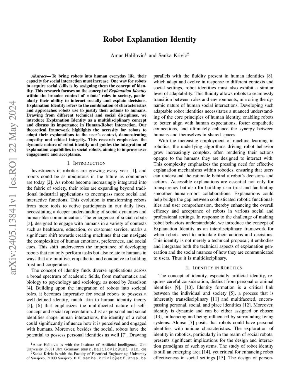 To bring robots into human everyday life, their capacity for social interaction must increase. One way for robots to acquire social skills is by assigning them the concept of identity. This research focuses on the concept of \textit{Explanation Identity} within the broader context of robots' roles in society, particularly their ability to interact socially and explain decisions. Explanation Identity refers to the combination of characteristics and approaches robots use to justify their actions to humans. Drawing from different technical and social disciplines, we introduce Explanation Identity as a multidisciplinary concept and discuss its importance in Human-Robot Interaction. Our theoretical framework highlights the necessity for robots to adapt their explanations to the user's context, demonstrating empathy and ethical integrity. This research emphasizes the dynamic nature of robot identity and guides the integration of explanation capabilities in social robots, aiming to improve user engagement and acceptance.