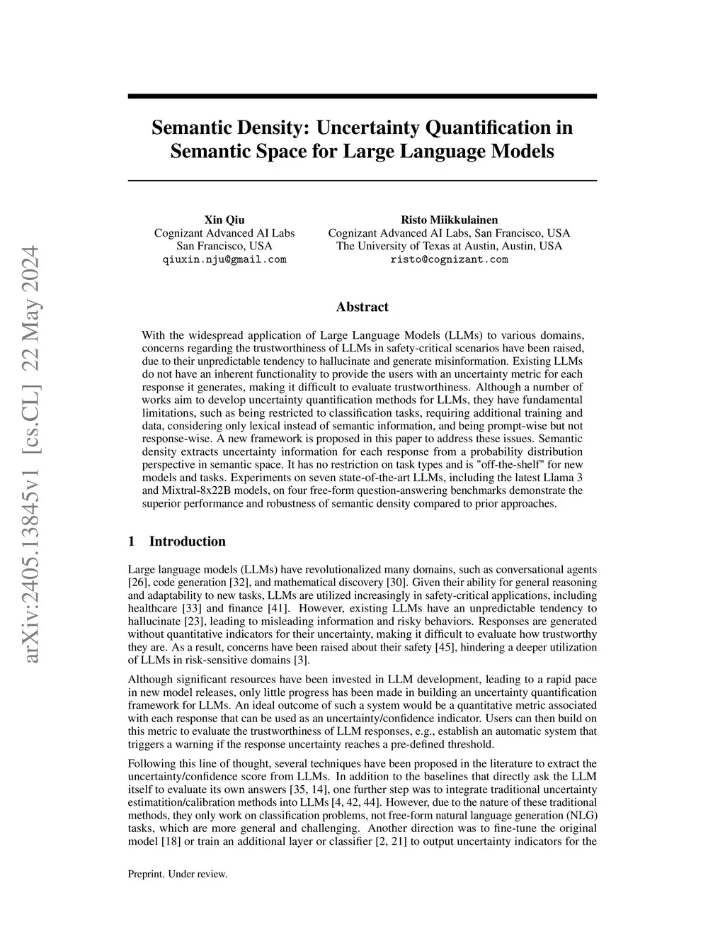 With the widespread application of Large Language Models (LLMs) to various domains, concerns regarding the trustworthiness of LLMs in safety-critical scenarios have been raised, due to their unpredictable tendency to hallucinate and generate misinformation. Existing LLMs do not have an inherent functionality to provide the users with an uncertainty metric for each response it generates, making it difficult to evaluate trustworthiness. Although a number of works aim to develop uncertainty quantification methods for LLMs, they have fundamental limitations, such as being restricted to classification tasks, requiring additional training and data, considering only lexical instead of semantic information, and being prompt-wise but not response-wise. A new framework is proposed in this paper to address these issues. Semantic density extracts uncertainty information for each response from a probability distribution perspective in semantic space. It has no restriction on task types and is "off-the-shelf" for new models and tasks. Experiments on seven state-of-the-art LLMs, including the latest Llama 3 and Mixtral-8x22B models, on four free-form question-answering benchmarks demonstrate the superior performance and robustness of semantic density compared to prior approaches.