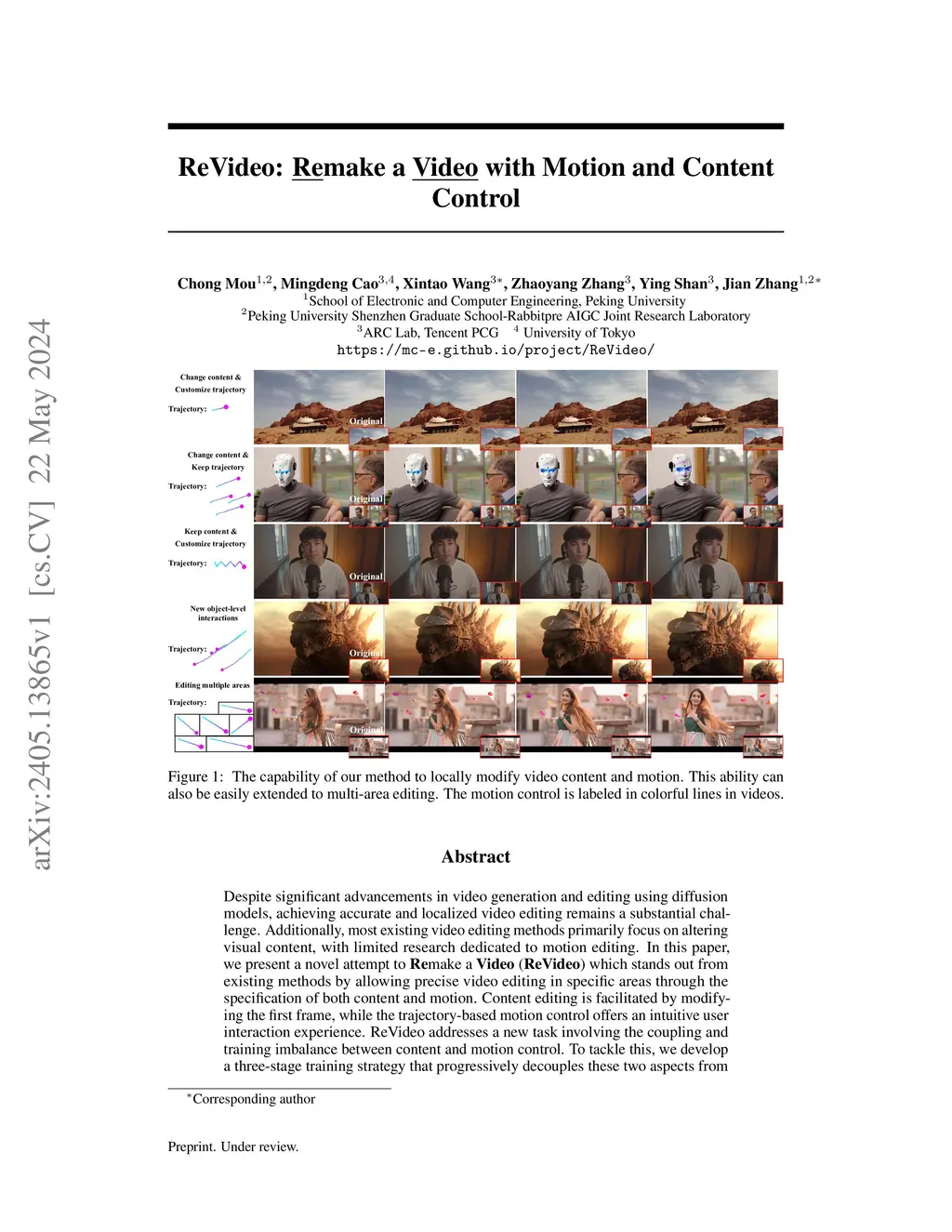 Despite significant advancements in video generation and editing using diffusion models, achieving accurate and localized video editing remains a substantial challenge. Additionally, most existing video editing methods primarily focus on altering visual content, with limited research dedicated to motion editing. In this paper, we present a novel attempt to Remake a Video (ReVideo) which stands out from existing methods by allowing precise video editing in specific areas through the specification of both content and motion. Content editing is facilitated by modifying the first frame, while the trajectory-based motion control offers an intuitive user interaction experience. ReVideo addresses a new task involving the coupling and training imbalance between content and motion control. To tackle this, we develop a three-stage training strategy that progressively decouples these two aspects from coarse to fine. Furthermore, we propose a spatiotemporal adaptive fusion module to integrate content and motion control across various sampling steps and spatial locations. Extensive experiments demonstrate that our ReVideo has promising performance on several accurate video editing applications, i.e., (1) locally changing video content while keeping the motion constant, (2) keeping content unchanged and customizing new motion trajectories, (3) modifying both content and motion trajectories. Our method can also seamlessly extend these applications to multi-area editing without specific training, demonstrating its flexibility and robustness.