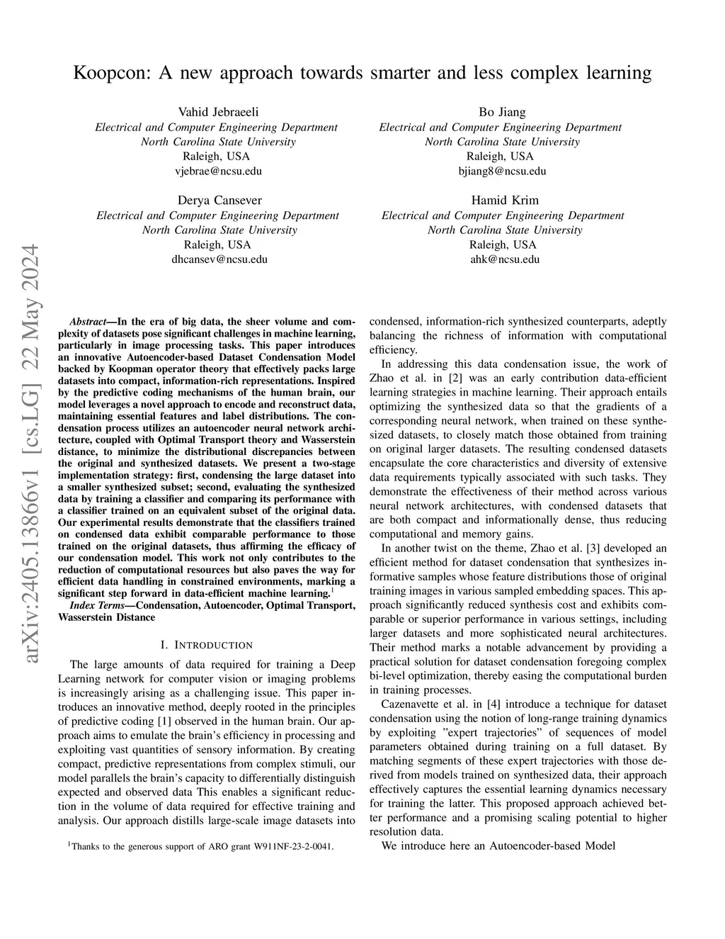 In the era of big data, the sheer volume and complexity of datasets pose significant challenges in machine learning, particularly in image processing tasks. This paper introduces an innovative Autoencoder-based Dataset Condensation Model backed by Koopman operator theory that effectively packs large datasets into compact, information-rich representations. Inspired by the predictive coding mechanisms of the human brain, our model leverages a novel approach to encode and reconstruct data, maintaining essential features and label distributions. The condensation process utilizes an autoencoder neural network architecture, coupled with Optimal Transport theory and Wasserstein distance, to minimize the distributional discrepancies between the original and synthesized datasets. We present a two-stage implementation strategy: first, condensing the large dataset into a smaller synthesized subset; second, evaluating the synthesized data by training a classifier and comparing its performance with a classifier trained on an equivalent subset of the original data. Our experimental results demonstrate that the classifiers trained on condensed data exhibit comparable performance to those trained on the original datasets, thus affirming the efficacy of our condensation model. This work not only contributes to the reduction of computational resources but also paves the way for efficient data handling in constrained environments, marking a significant step forward in data-efficient machine learning.