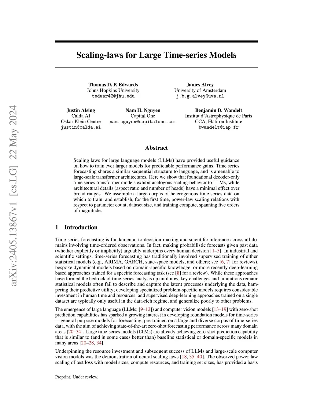 Scaling laws for large language models (LLMs) have provided useful guidance in training ever larger models for predictable performance gains. Time series forecasting shares a similar sequential structure to language, and is amenable to large-scale transformer architectures. Here we show that foundational decoder-only time series transformer models exhibit analogous scaling-behavior to LLMs, with architectural details (aspect ratio and number of heads) having a minimal effect over broad ranges. We assemble a large corpus of heterogenous time series data on which to train, and establish for the first time power-law scaling with parameter count, dataset size, and training compute, spanning five orders of magnitude.