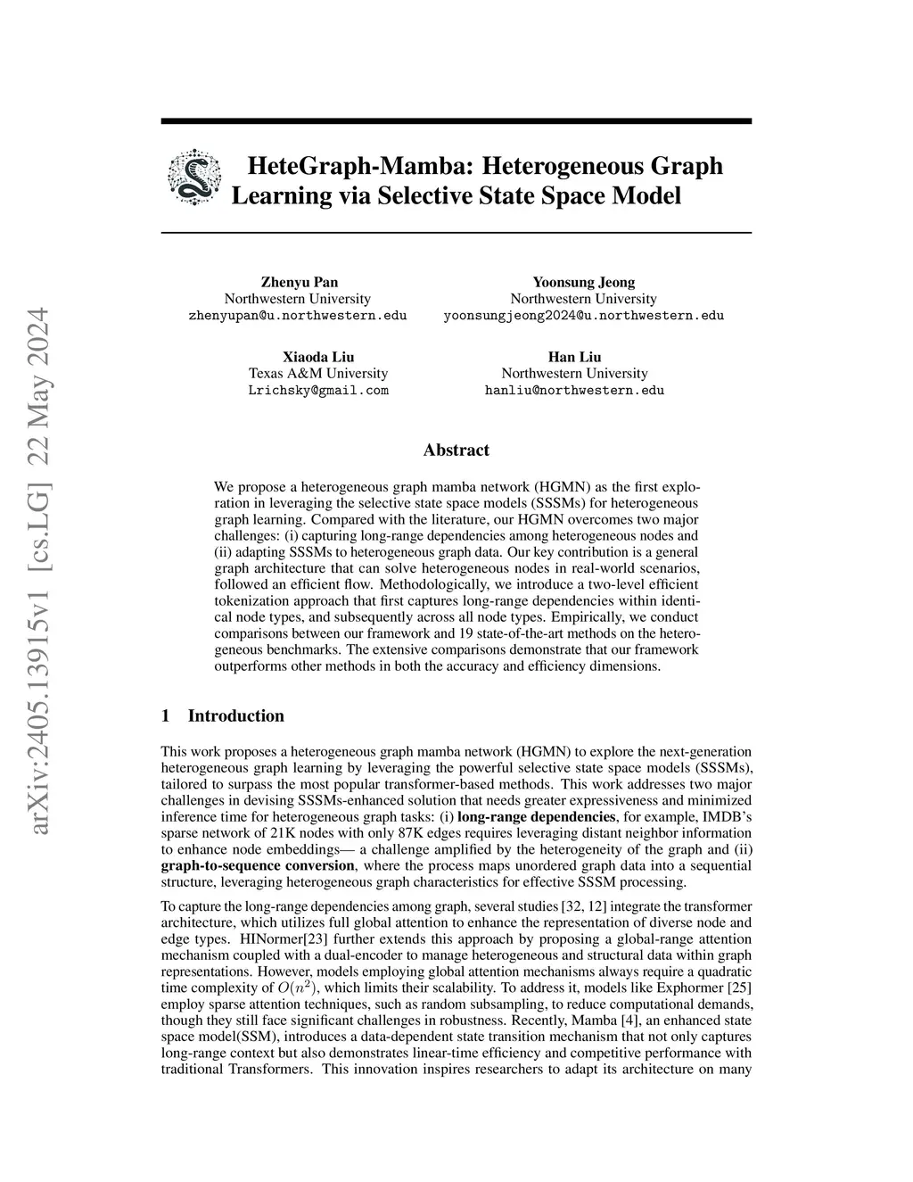 We propose a heterogeneous graph mamba network (HGMN) as the first exploration in leveraging the selective state space models (SSSMs) for heterogeneous graph learning. Compared with the literature, our HGMN overcomes two major challenges: (i) capturing long-range dependencies among heterogeneous nodes and (ii) adapting SSSMs to heterogeneous graph data. Our key contribution is a general graph architecture that can solve heterogeneous nodes in real-world scenarios, followed an efficient flow. Methodologically, we introduce a two-level efficient tokenization approach that first captures long-range dependencies within identical node types, and subsequently across all node types. Empirically, we conduct comparisons between our framework and 19 state-of-the-art methods on the heterogeneous benchmarks. The extensive comparisons demonstrate that our framework outperforms other methods in both the accuracy and efficiency dimensions.