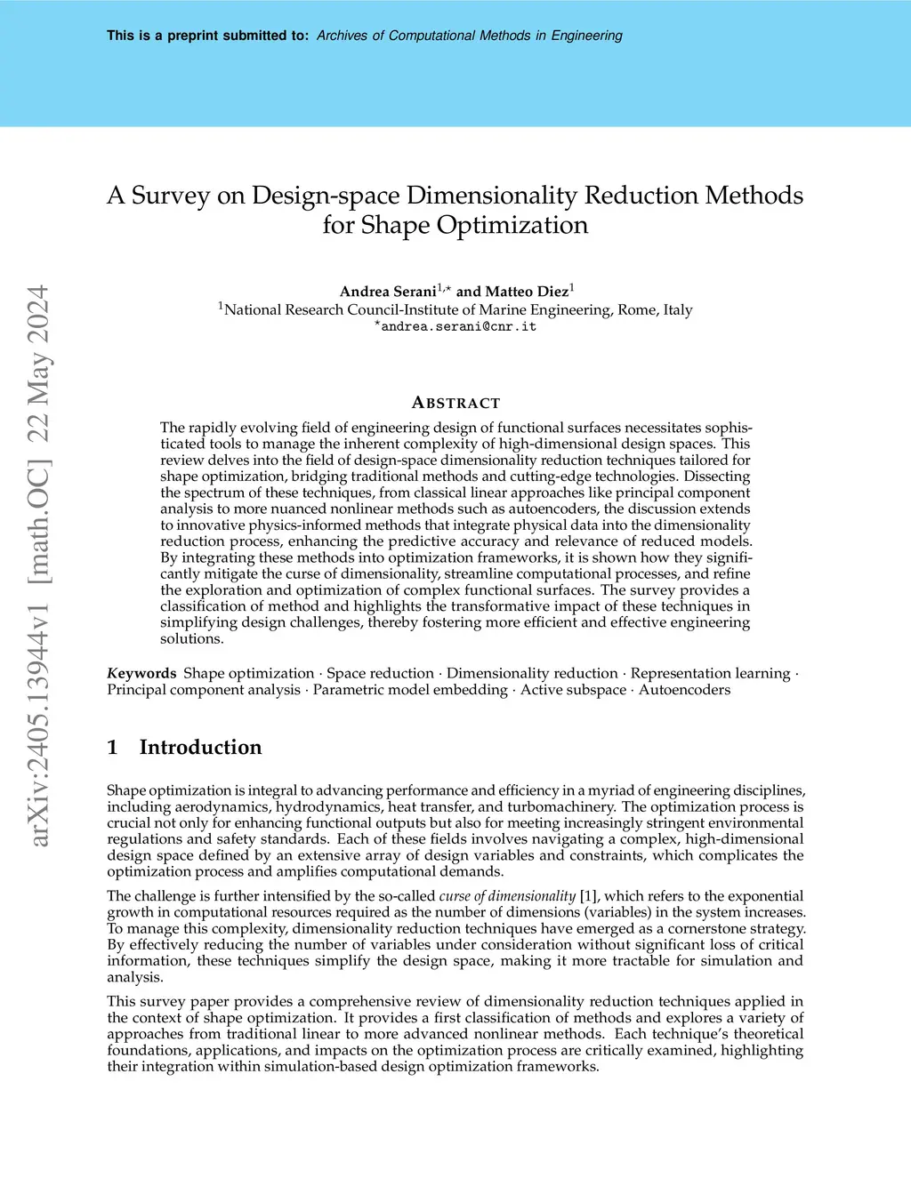 The rapidly evolving field of engineering design of functional surfaces necessitates sophisticated tools to manage the inherent complexity of high-dimensional design spaces. This survey paper offers a scoping review, i.e., a literature mapping synthesis borrowed from clinical medicine, delving into the field of design-space dimensionality reduction techniques tailored for shape optimization, bridging traditional methods and cutting-edge technologies. Dissecting the spectrum of these techniques, from classical linear approaches like principal component analysis to more nuanced nonlinear methods such as autoencoders, the discussion extends to innovative physics-informed methods that integrate physical data into the dimensionality reduction process, enhancing the physical relevance and effectiveness of reduced design spaces. By integrating these methods into optimization frameworks, it is shown how they significantly mitigate the curse of dimensionality, streamline computational processes, and refine the design exploration and optimization of complex functional surfaces. The survey provides a classification of methods and highlights the transformative impact of these techniques in simplifying design challenges, thereby fostering more efficient and effective engineering solutions.
