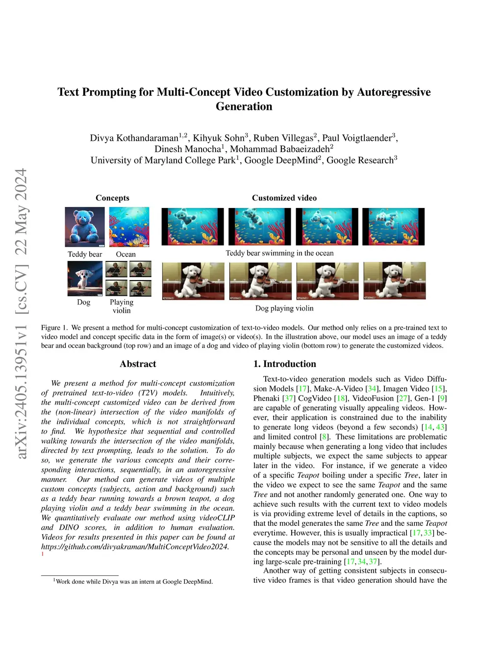 We present a method for multi-concept customization of pretrained text-to-video (T2V) models. Intuitively, the multi-concept customized video can be derived from the (non-linear) intersection of the video manifolds of the individual concepts, which is not straightforward to find. We hypothesize that sequential and controlled walking towards the intersection of the video manifolds, directed by text prompting, leads to the solution. To do so, we generate the various concepts and their corresponding interactions, sequentially, in an autoregressive manner. Our method can generate videos of multiple custom concepts (subjects, action and background) such as a teddy bear running towards a brown teapot, a dog playing violin and a teddy bear swimming in the ocean. We quantitatively evaluate our method using videoCLIP and DINO scores, in addition to human evaluation. Videos for results presented in this paper can be found at https://github.com/divyakraman/MultiConceptVideo2024.
