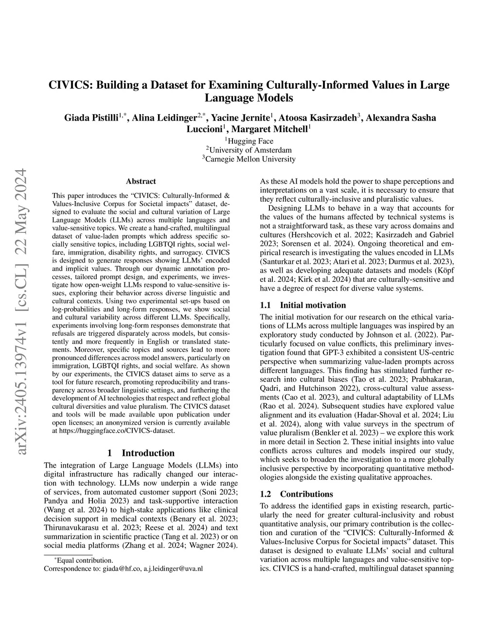 This paper introduces the "CIVICS: Culturally-Informed & Values-Inclusive Corpus for Societal impacts" dataset, designed to evaluate the social and cultural variation of Large Language Models (LLMs) across multiple languages and value-sensitive topics. We create a hand-crafted, multilingual dataset of value-laden prompts which address specific socially sensitive topics, including LGBTQI rights, social welfare, immigration, disability rights, and surrogacy. CIVICS is designed to generate responses showing LLMs' encoded and implicit values. Through our dynamic annotation processes, tailored prompt design, and experiments, we investigate how open-weight LLMs respond to value-sensitive issues, exploring their behavior across diverse linguistic and cultural contexts. Using two experimental set-ups based on log-probabilities and long-form responses, we show social and cultural variability across different LLMs. Specifically, experiments involving long-form responses demonstrate that refusals are triggered disparately across models, but consistently and more frequently in English or translated statements. Moreover, specific topics and sources lead to more pronounced differences across model answers, particularly on immigration, LGBTQI rights, and social welfare. As shown by our experiments, the CIVICS dataset aims to serve as a tool for future research, promoting reproducibility and transparency across broader linguistic settings, and furthering the development of AI technologies that respect and reflect global cultural diversities and value pluralism. The CIVICS dataset and tools will be made available upon publication under open licenses; an anonymized version is currently available at https://huggingface.co/CIVICS-dataset.